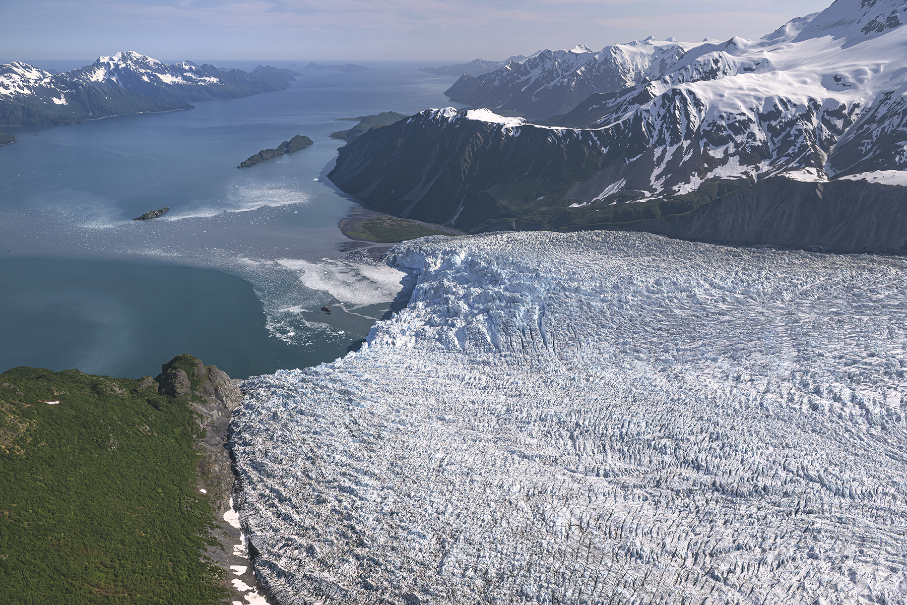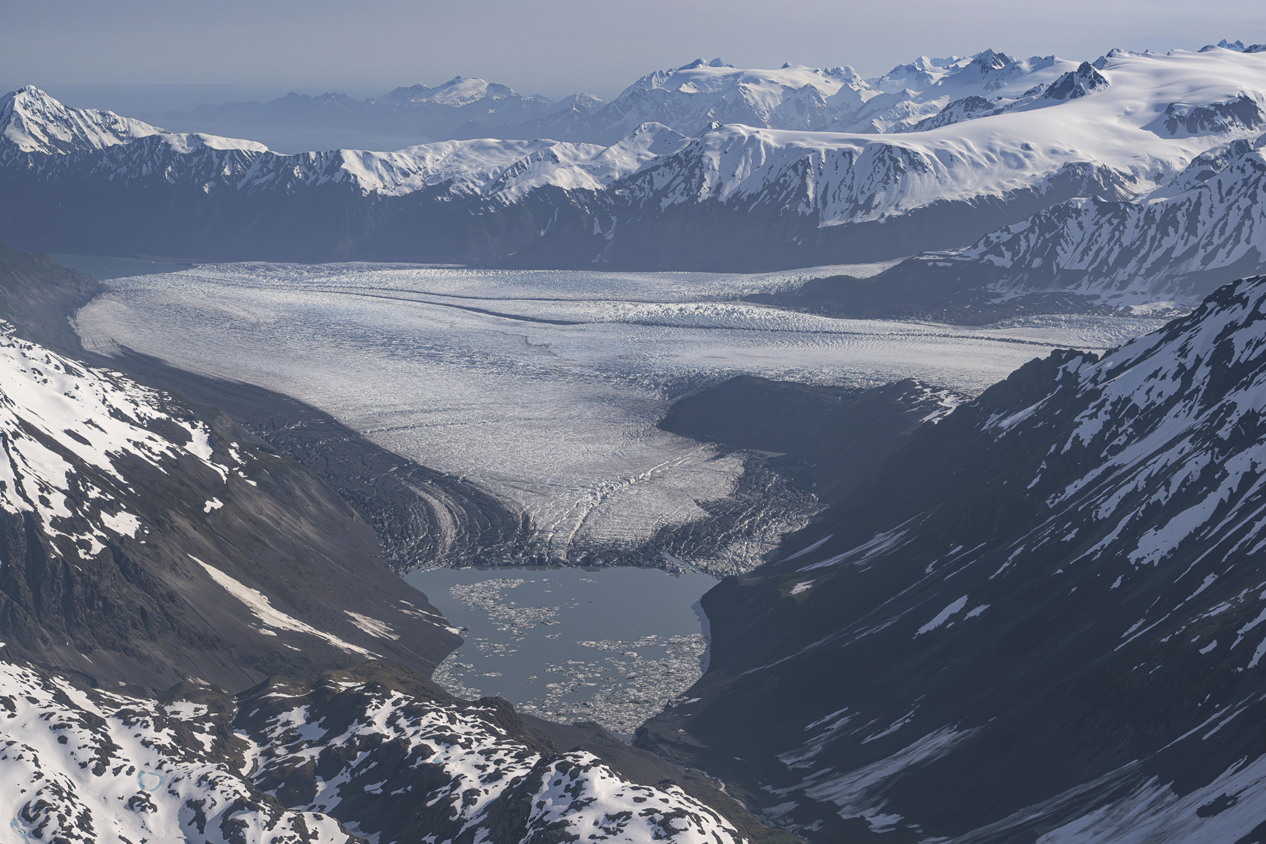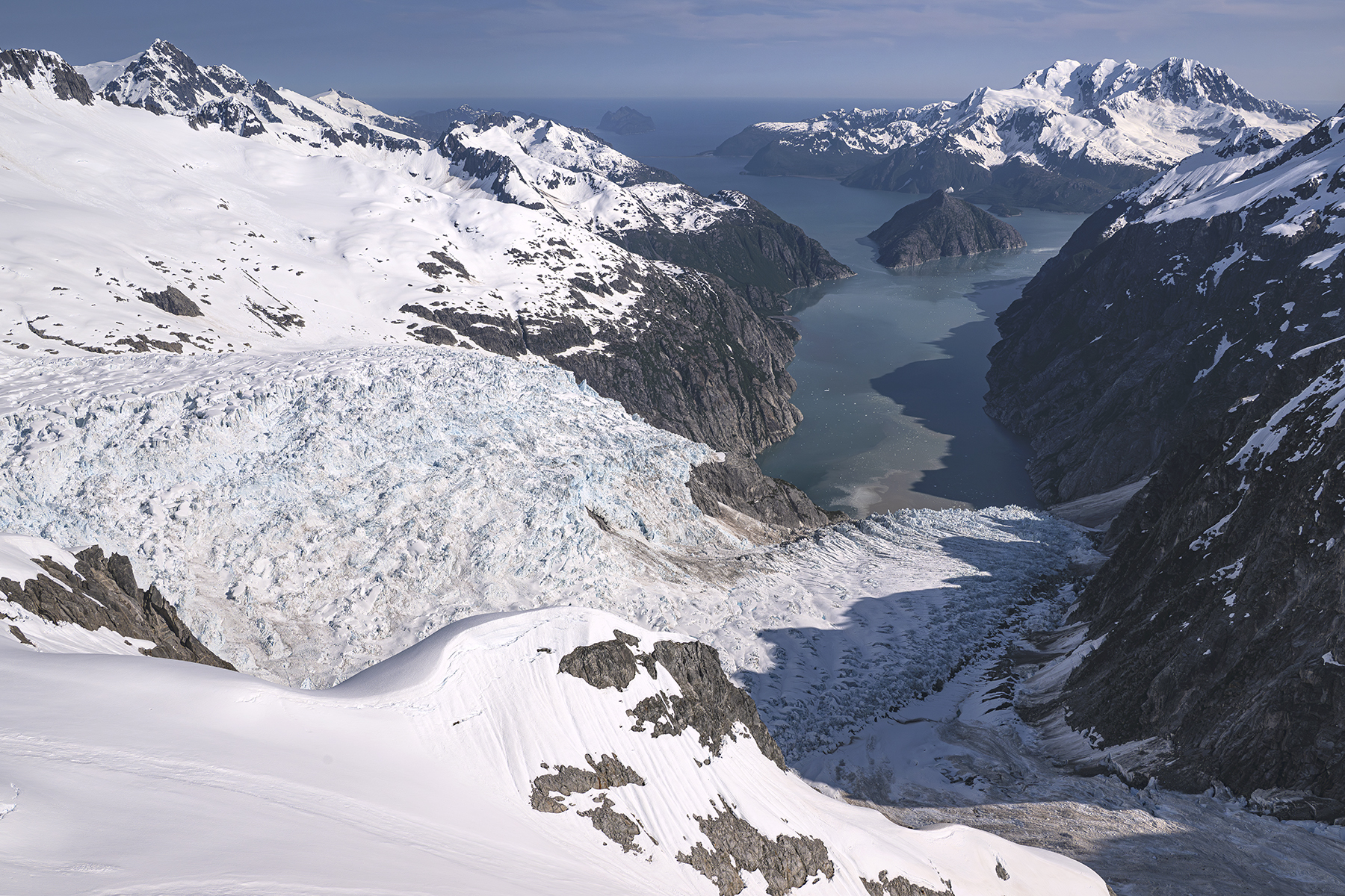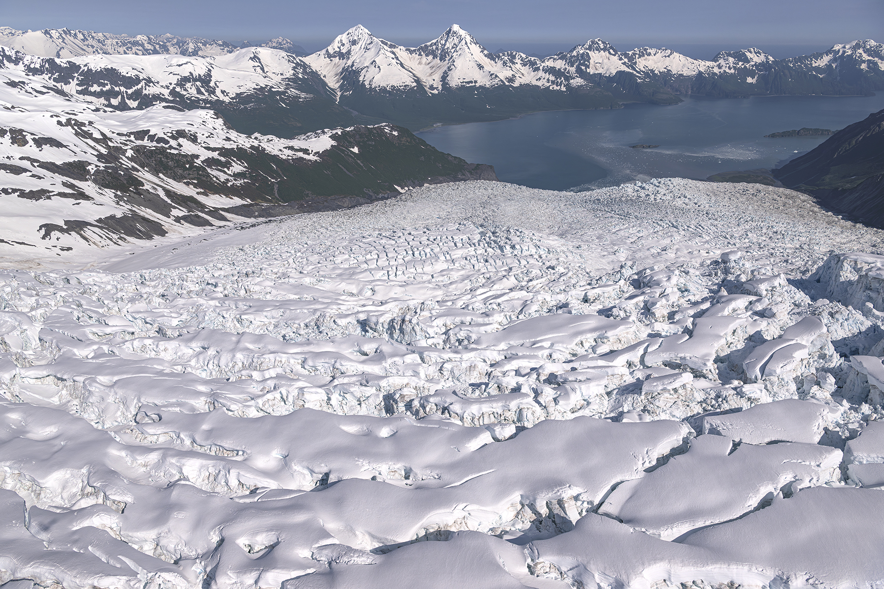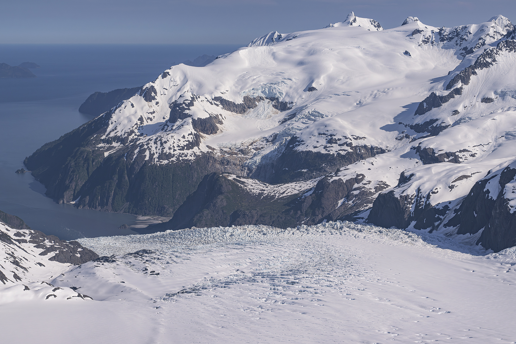 Le Kenai Fjords National Park est un lieu où se rencontrent les montagnes, la glace et l’océan. La petite ville de Seward en constitue la porte d’accès. Essentiellement marin, il ne se visite que par bateau. Différents types de croisières sont proposées afin de découvrir les animaux marins, les baies et les glaciers. Ces derniers, au nombre d’une quarantaine et provenant principalement du champ de glace Harding, se jettent presque tous dans la mer. Le Bear Glacier est le plus grand d’entre eux mais fond rapidement en raison du changement climatique. Le meilleur moyen pour photographier les paysages glaciaires du parc est l’avion taxi, bien que très peu de compagnies offrent ce service. En l’espace de 90 minutes, à bord du Piper Super Cub de la compagnie AA Seward Air Tours, nous avons réalisé des prises de vue du Harding Icefield (images 10 à 14), du Bear Glacier (images 5 à 8, 19 à 22 et 24) de l’AiakalikGlacier (images 1 à 4), du Northwestern Glacier (images 15 à 17). Les images 31 à 36 montrent les Îles Chiswell qui font partie de l’Alaska Maritime National Wildlife Refuge et qui abritent des colonies d’oiseaux marins, tels que mouettes tridactyles, guillemots de Troïl, guillemots colombin, macareux cornus, macareux huppés et cormorans pélagiques.