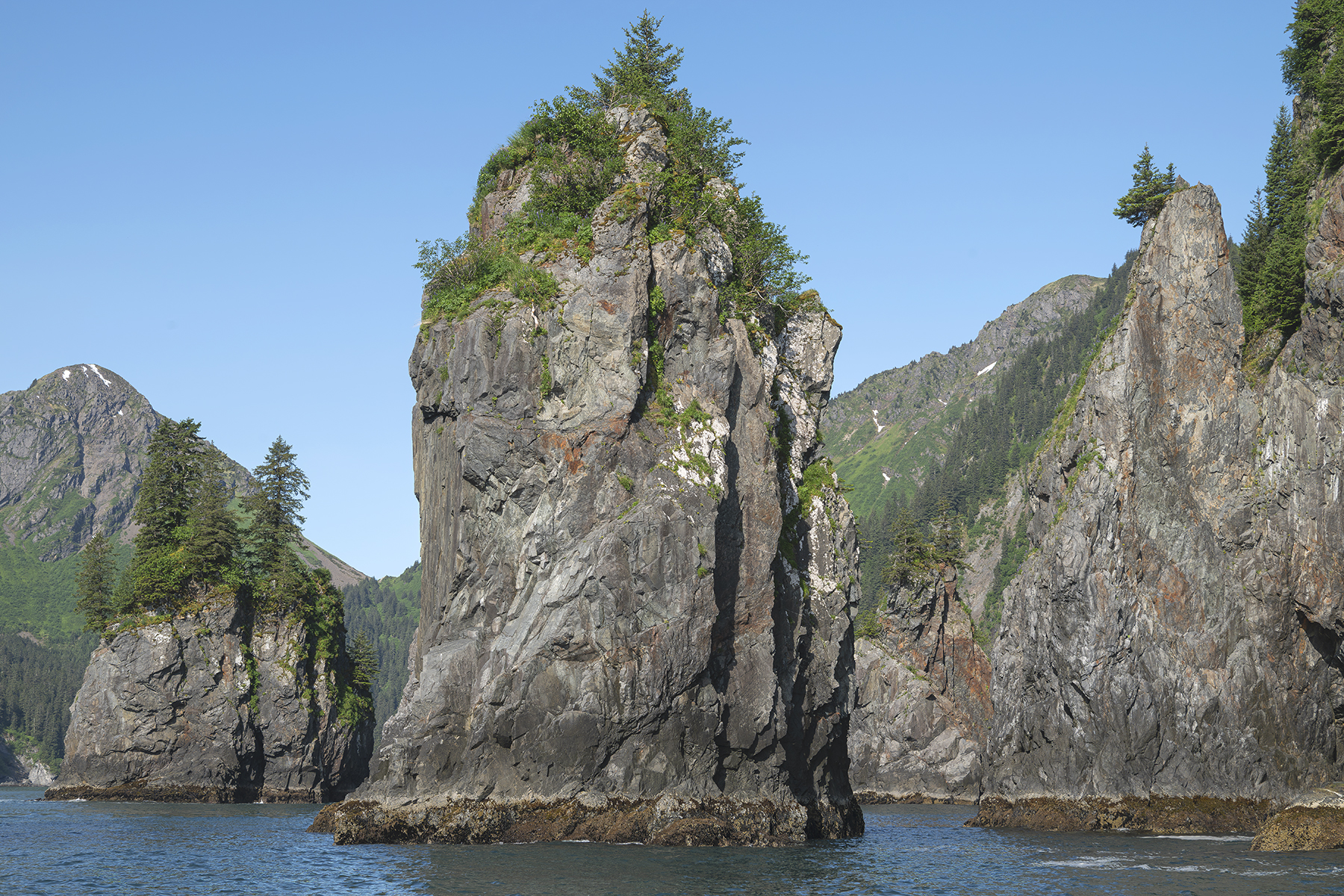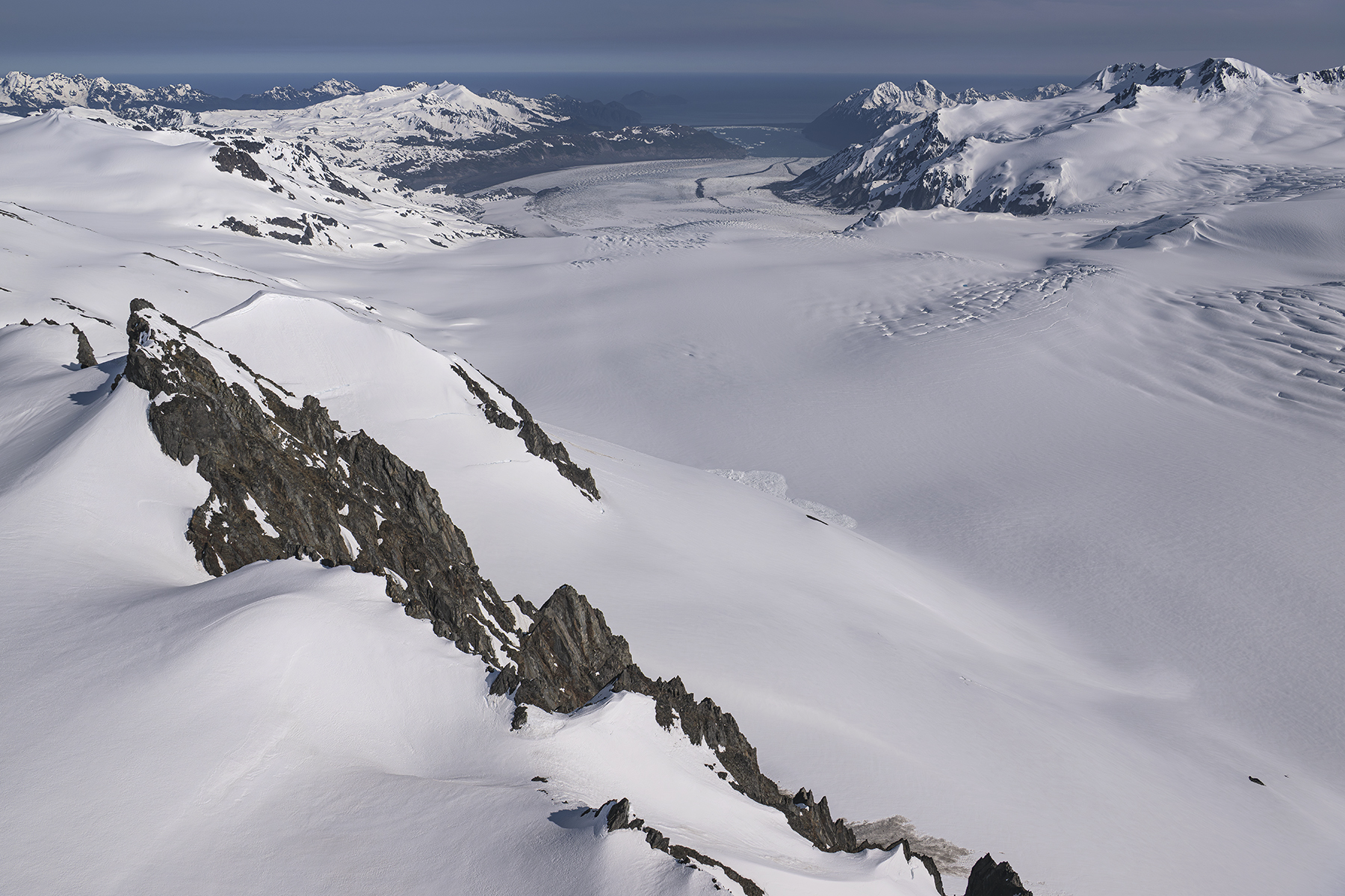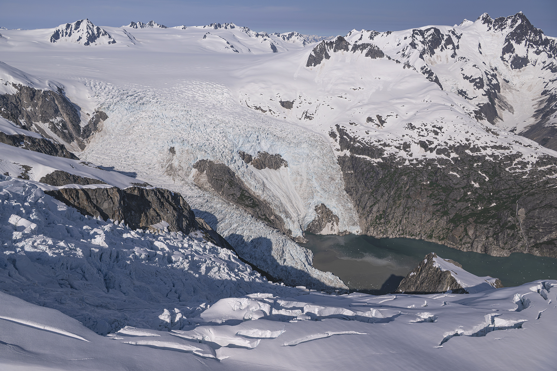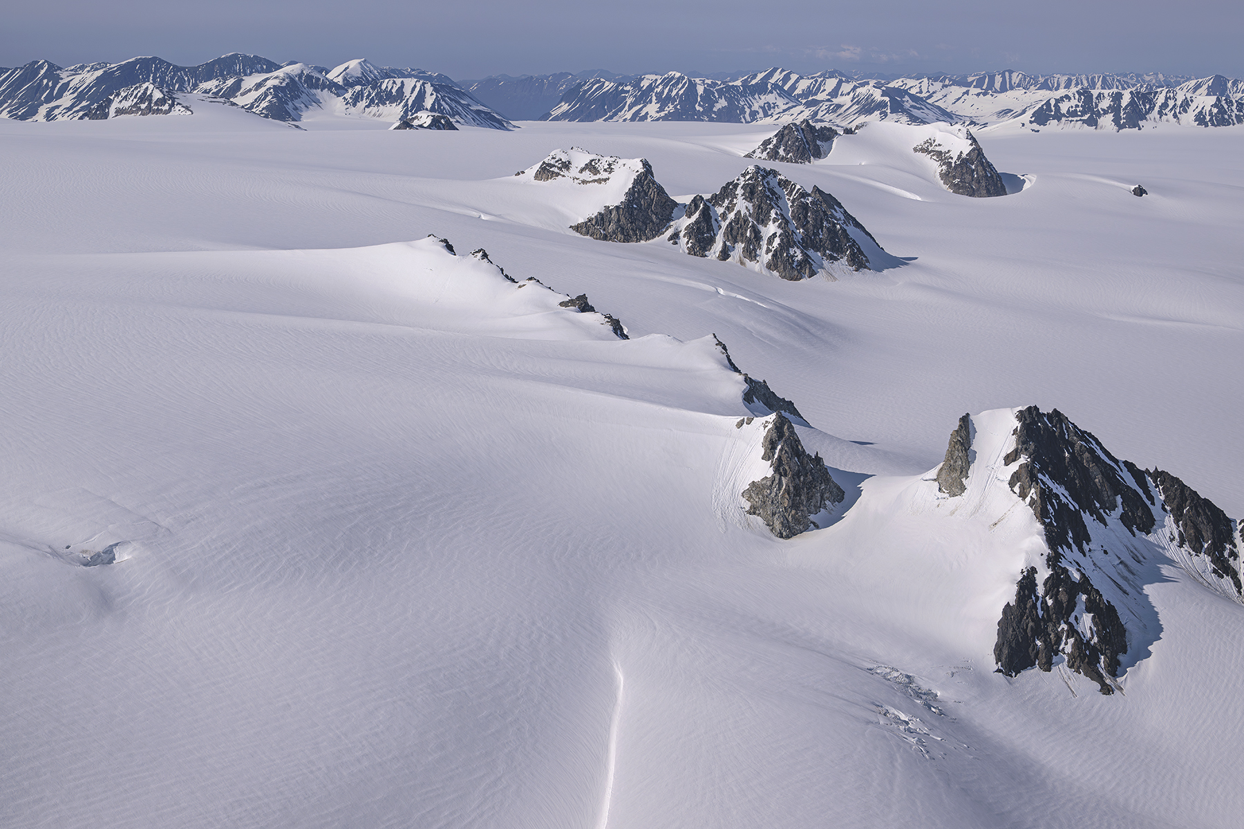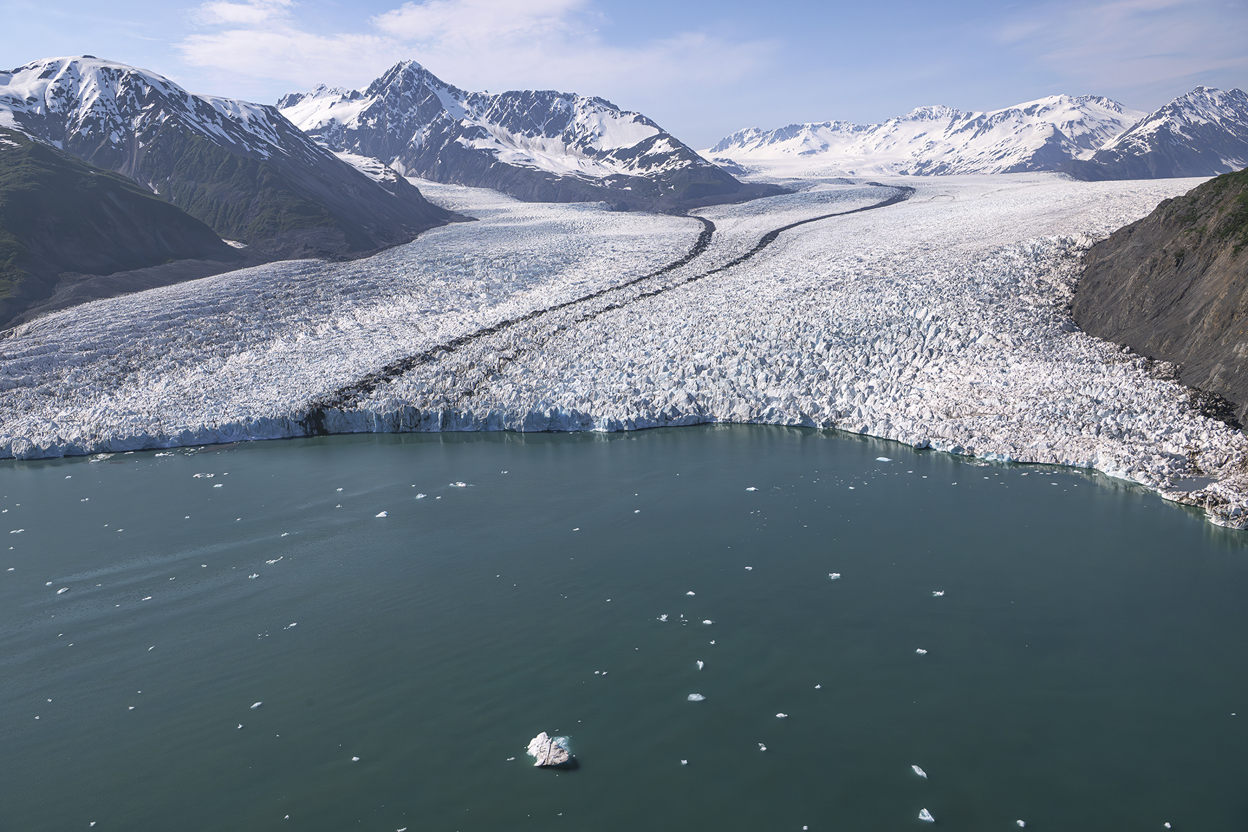 Le Kenai Fjords National Park est un lieu où se rencontrent les montagnes, la glace et l’océan. La petite ville de Seward en constitue la porte d’accès. Essentiellement marin, il ne se visite que par bateau. Différents types de croisières sont proposées afin de découvrir les animaux marins, les baies et les glaciers. Ces derniers, au nombre d’une quarantaine et provenant principalement du champ de glace Harding, se jettent presque tous dans la mer. Le Bear Glacier est le plus grand d’entre eux mais fond rapidement en raison du changement climatique. Le meilleur moyen pour photographier les paysages glaciaires du parc est l’avion taxi, bien que très peu de compagnies offrent ce service. En l’espace de 90 minutes, à bord du Piper Super Cub de la compagnie AA Seward Air Tours, nous avons réalisé des prises de vue du Harding Icefield (images 10 à 14), du Bear Glacier (images 5 à 8, 19 à 22 et 24) de l’AiakalikGlacier (images 1 à 4), du Northwestern Glacier (images 15 à 17). Les images 31 à 36 montrent les Îles Chiswell qui font partie de l’Alaska Maritime National Wildlife Refuge et qui abritent des colonies d’oiseaux marins, tels que mouettes tridactyles, guillemots de Troïl, guillemots colombin, macareux cornus, macareux huppés et cormorans pélagiques.