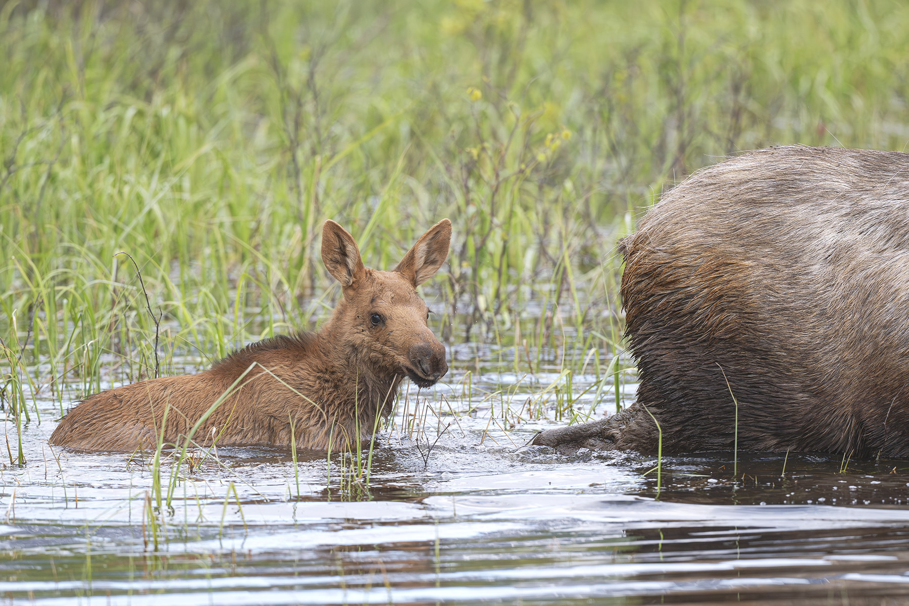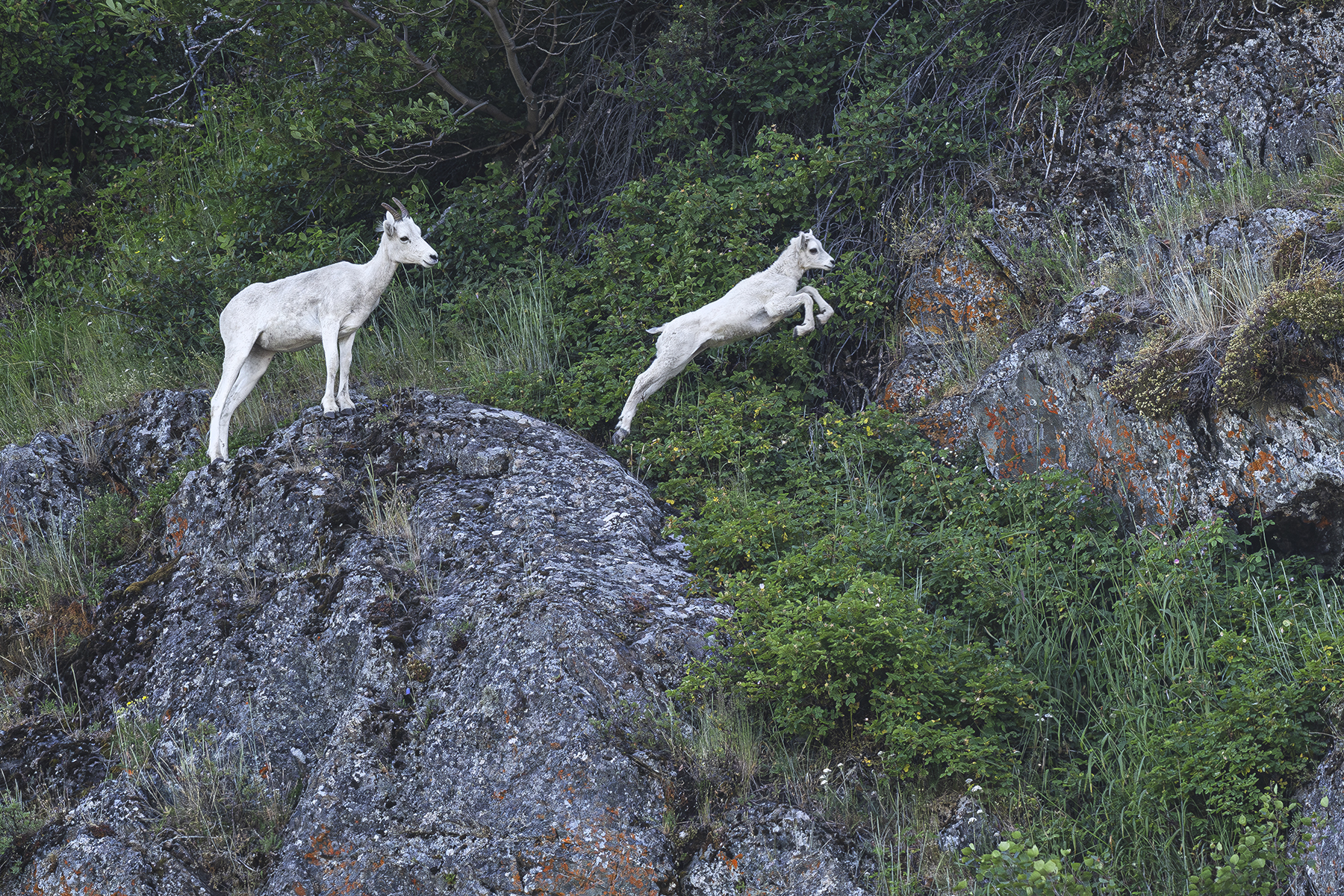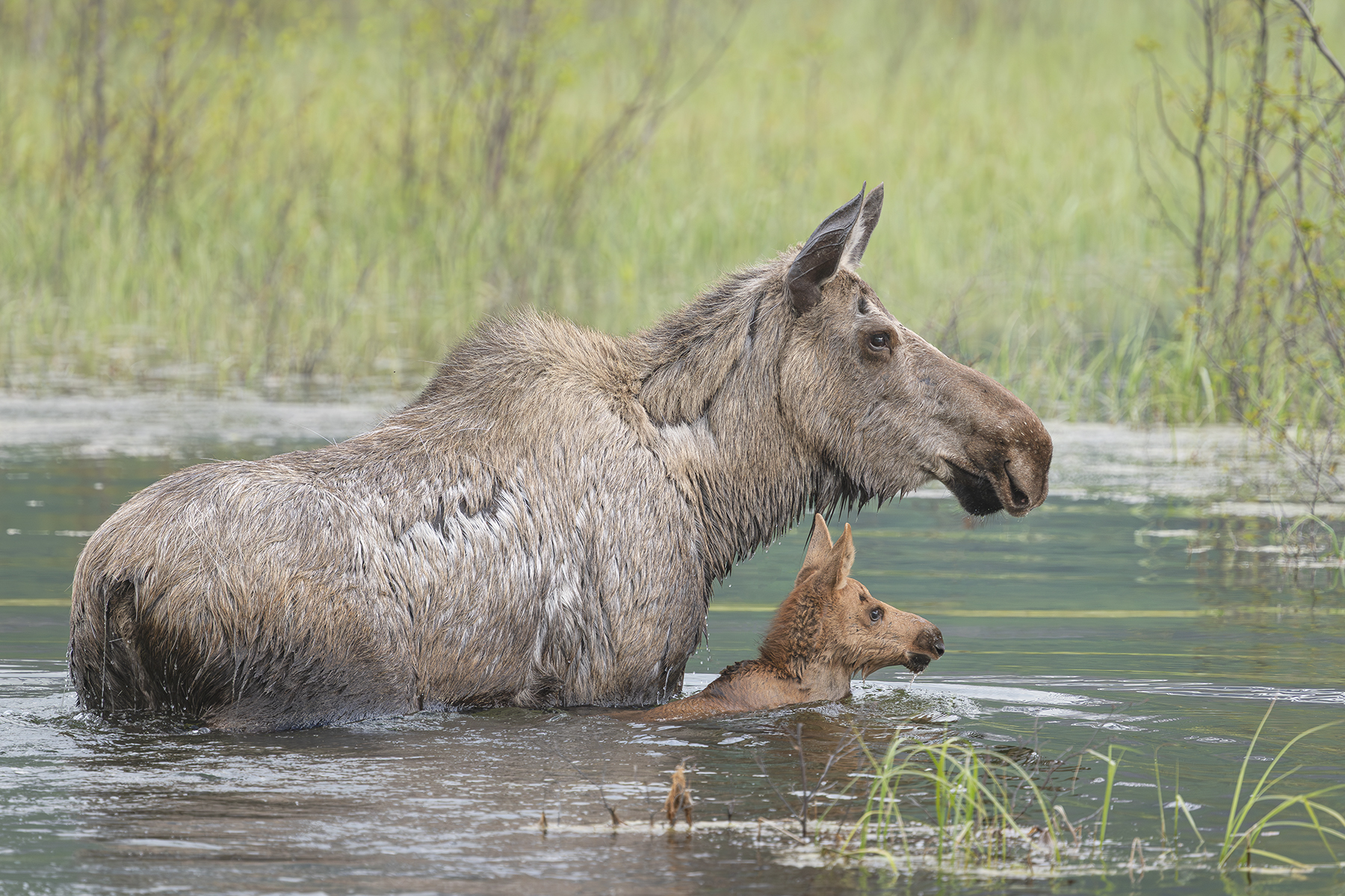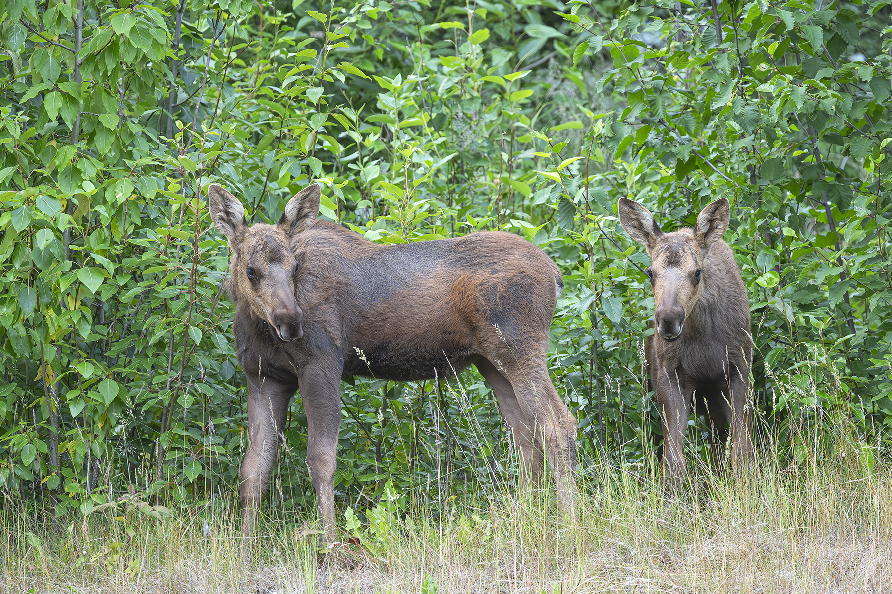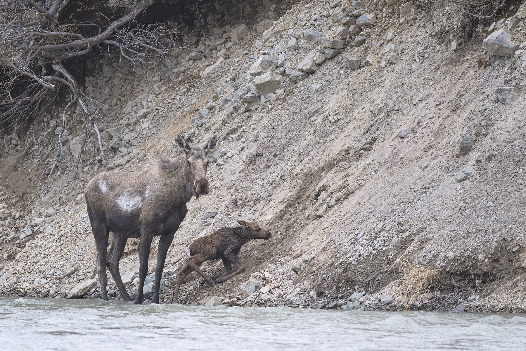 La fin du printemps et le début de l’été sont les meilleures périodes pour photographier les femelles et leurs jeunes de l’année. Quelle que soit l’espèce, l’exercice demande énormément de patience, de persévérance et de chance, les animaux demeurant extrêmement discrets et vigilants durant cette étape de la reproduction. En début d’été, nous avons photographié quelques femelles et cabris du Mouflon de Dall (images 1 à 4) dans les Chugach Mountains et une femelle de Marmotte des Rocheuses surveillant ses trois marmottons dans les Talkeetna Mountains (images 5 à 7). Fin-mai, en différents endroits, nous avons trouvé quelques orignaux en pleine mue printanière (images 11 et 21 à 23). Le 29 mai, aux abords de la Delta River, nous avons découvert une femelle d’Orignal et son petit, né probablement le jour-même ou le jour précédent (images 15 et 16). Immobilisés inconfortablement entre un ravin et le courant impétueux de la rivière, la femelle ne semblait trouver aucune issue alors que son petit, pris de panique, beuglait au point d’être secouru par une autre et superbe femelle non suitée (image 17). Début juin, dans la région d’Eagle River, alors que nous faisions de l’affût au castor, une femelle d’Orignal et son petit, poursuivis par un ours brun, ont déboulé à quelques mètres de nos objectifs (images 12 à 14). N’ayant eu que très peu d’opportunités de rencontrer des castors, nous nous sommes reportés sur le Rat musqué que nous avons observé à huit reprises (images 27 à 29). Enfin, gros coup de chance à Homer, en parcourant l’un des sentiers du Wynn Nature Center : après maintes recherches infructueuses, nous réussissons enfin à photographier une femelle de Porc-épic et son petit. Il nous aura fallu patienter plus de deux heures pour que le nouveau-né veuille bien nous montrer sa sympathique frimousse.