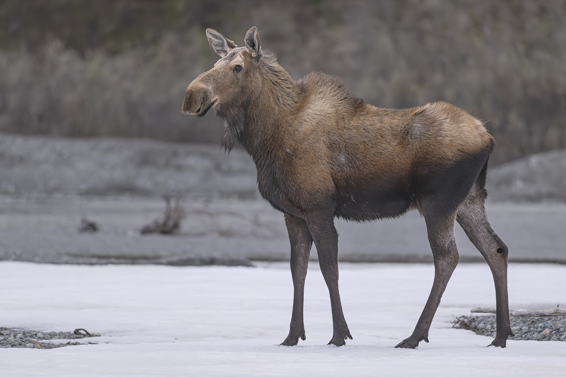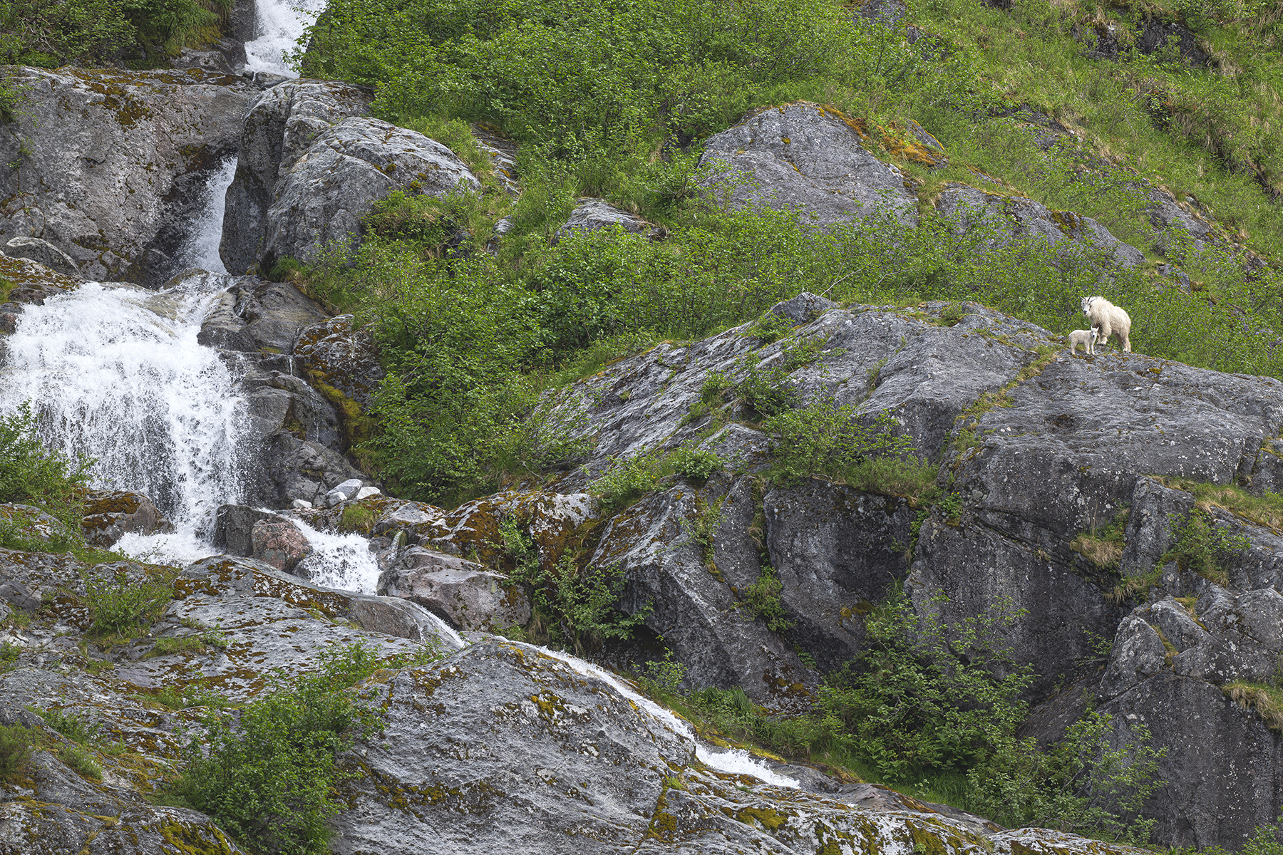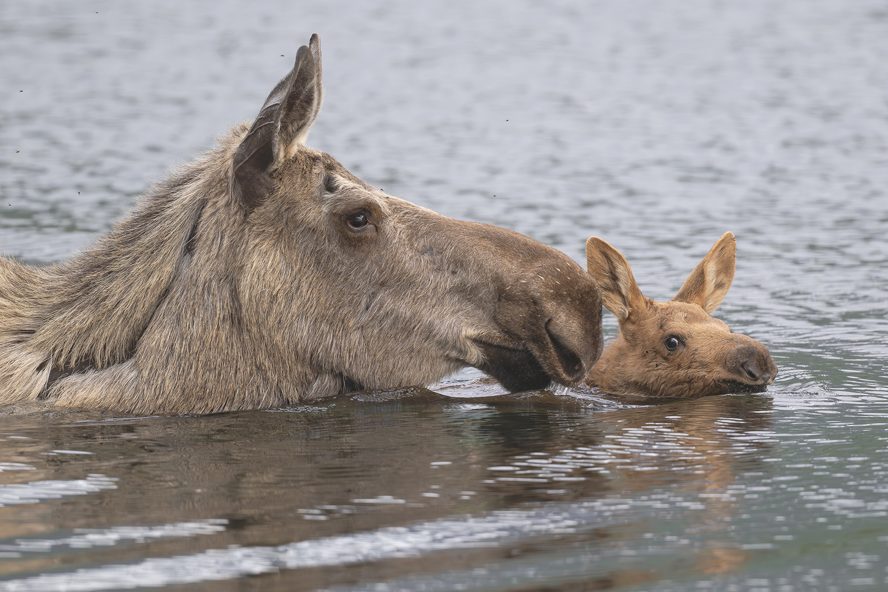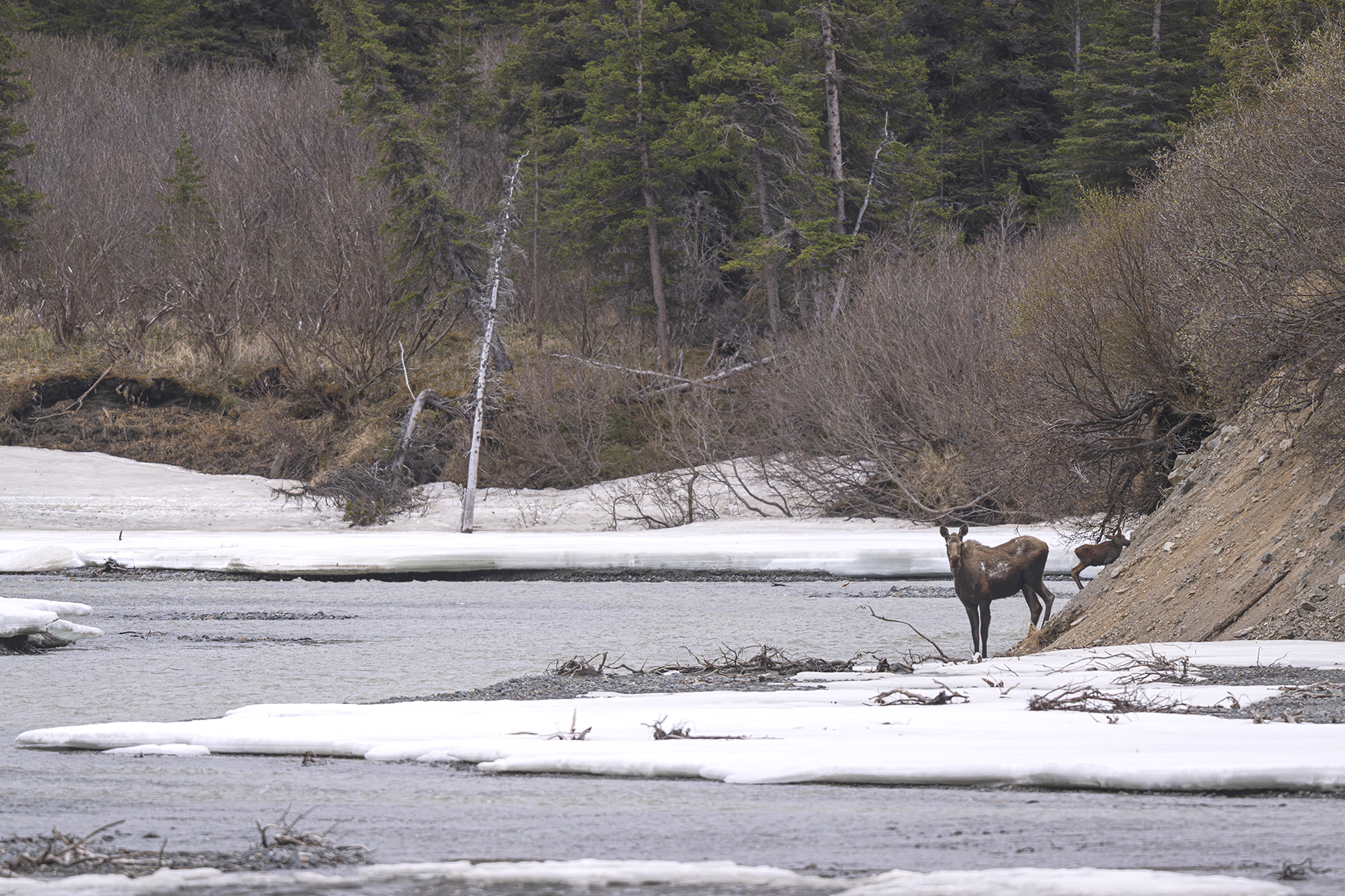 La fin du printemps et le début de l’été sont les meilleures périodes pour photographier les femelles et leurs jeunes de l’année. Quelle que soit l’espèce, l’exercice demande énormément de patience, de persévérance et de chance, les animaux demeurant extrêmement discrets et vigilants durant cette étape de la reproduction. En début d’été, nous avons photographié quelques femelles et cabris du Mouflon de Dall (images 1 à 4) dans les Chugach Mountains et une femelle de Marmotte des Rocheuses surveillant ses trois marmottons dans les Talkeetna Mountains (images 5 à 7). Fin-mai, en différents endroits, nous avons trouvé quelques orignaux en pleine mue printanière (images 11 et 21 à 23). Le 29 mai, aux abords de la Delta River, nous avons découvert une femelle d’Orignal et son petit, né probablement le jour-même ou le jour précédent (images 15 et 16). Immobilisés inconfortablement entre un ravin et le courant impétueux de la rivière, la femelle ne semblait trouver aucune issue alors que son petit, pris de panique, beuglait au point d’être secouru par une autre et superbe femelle non suitée (image 17). Début juin, dans la région d’Eagle River, alors que nous faisions de l’affût au castor, une femelle d’Orignal et son petit, poursuivis par un ours brun, ont déboulé à quelques mètres de nos objectifs (images 12 à 14). N’ayant eu que très peu d’opportunités de rencontrer des castors, nous nous sommes reportés sur le Rat musqué que nous avons observé à huit reprises (images 27 à 29). Enfin, gros coup de chance à Homer, en parcourant l’un des sentiers du Wynn Nature Center : après maintes recherches infructueuses, nous réussissons enfin à photographier une femelle de Porc-épic et son petit. Il nous aura fallu patienter plus de deux heures pour que le nouveau-né veuille bien nous montrer sa sympathique frimousse.
