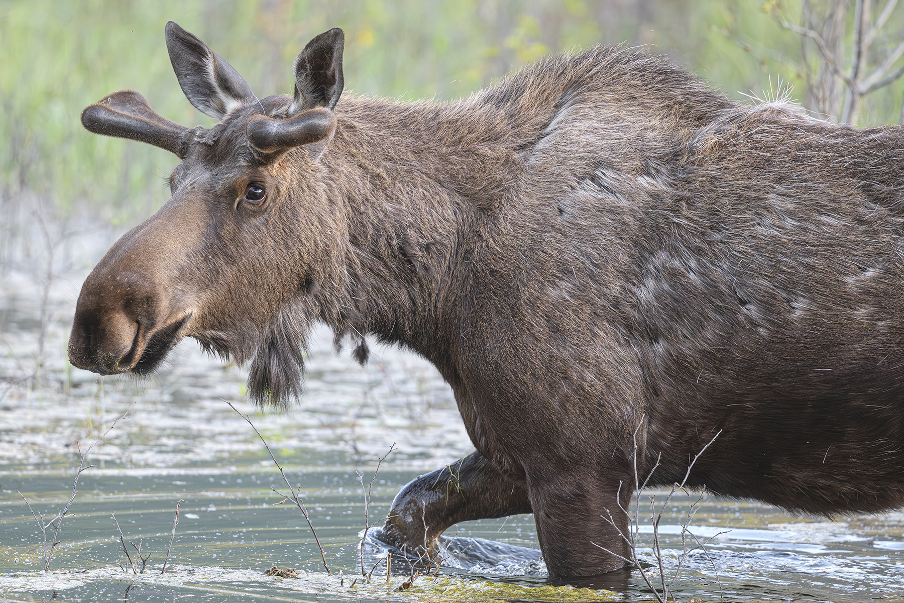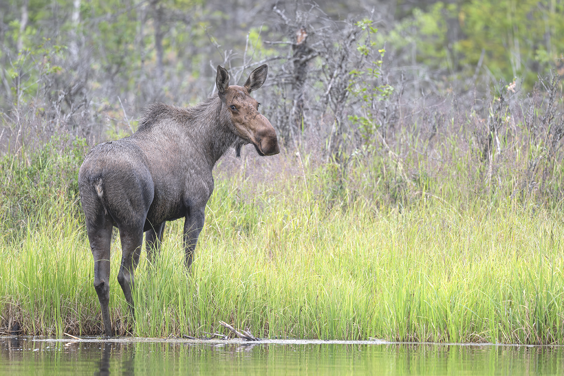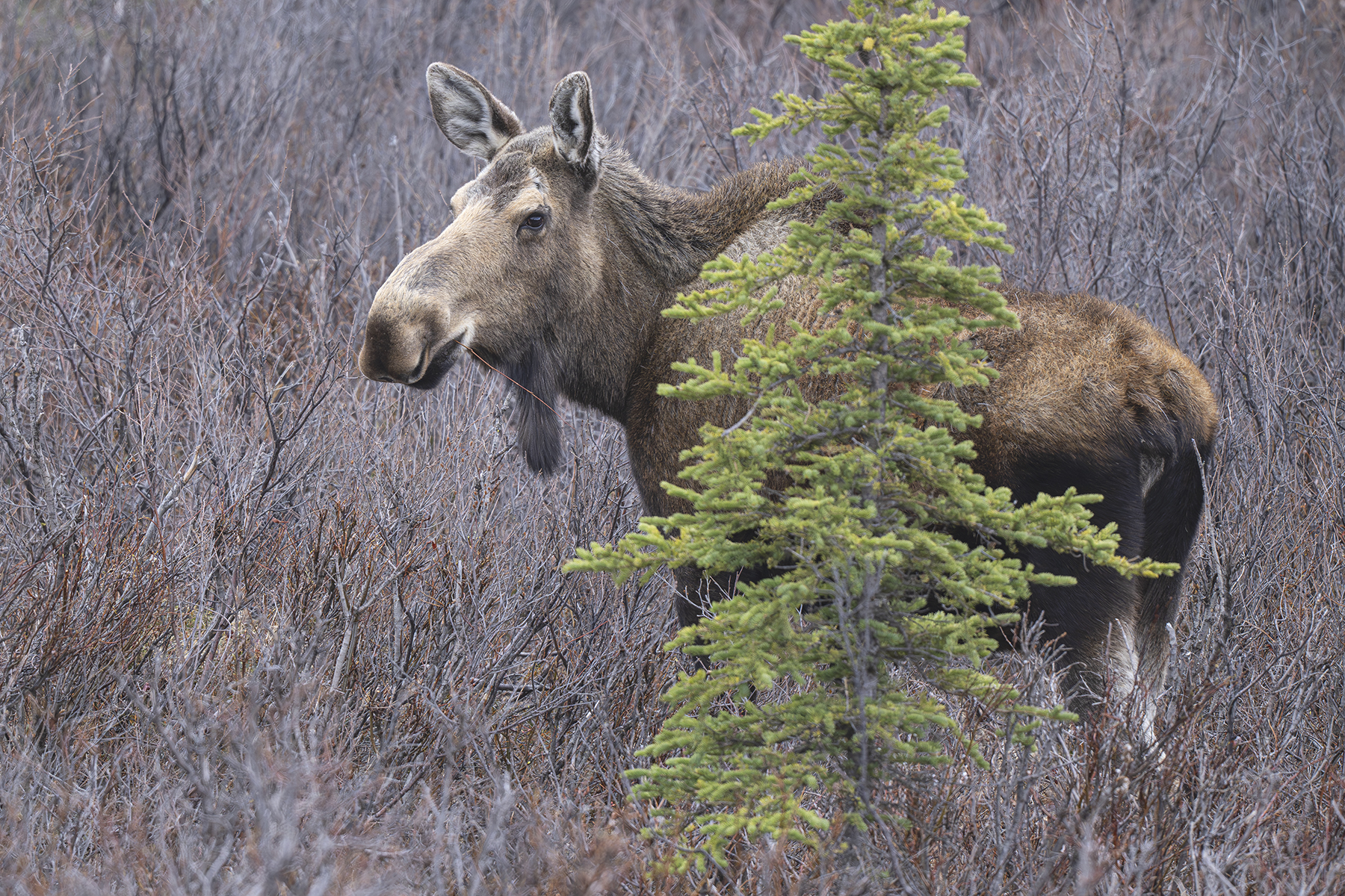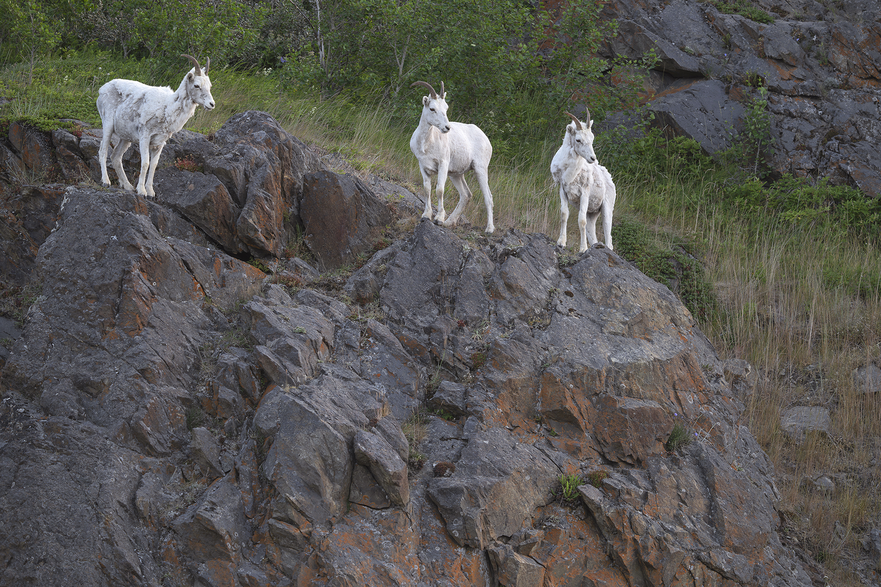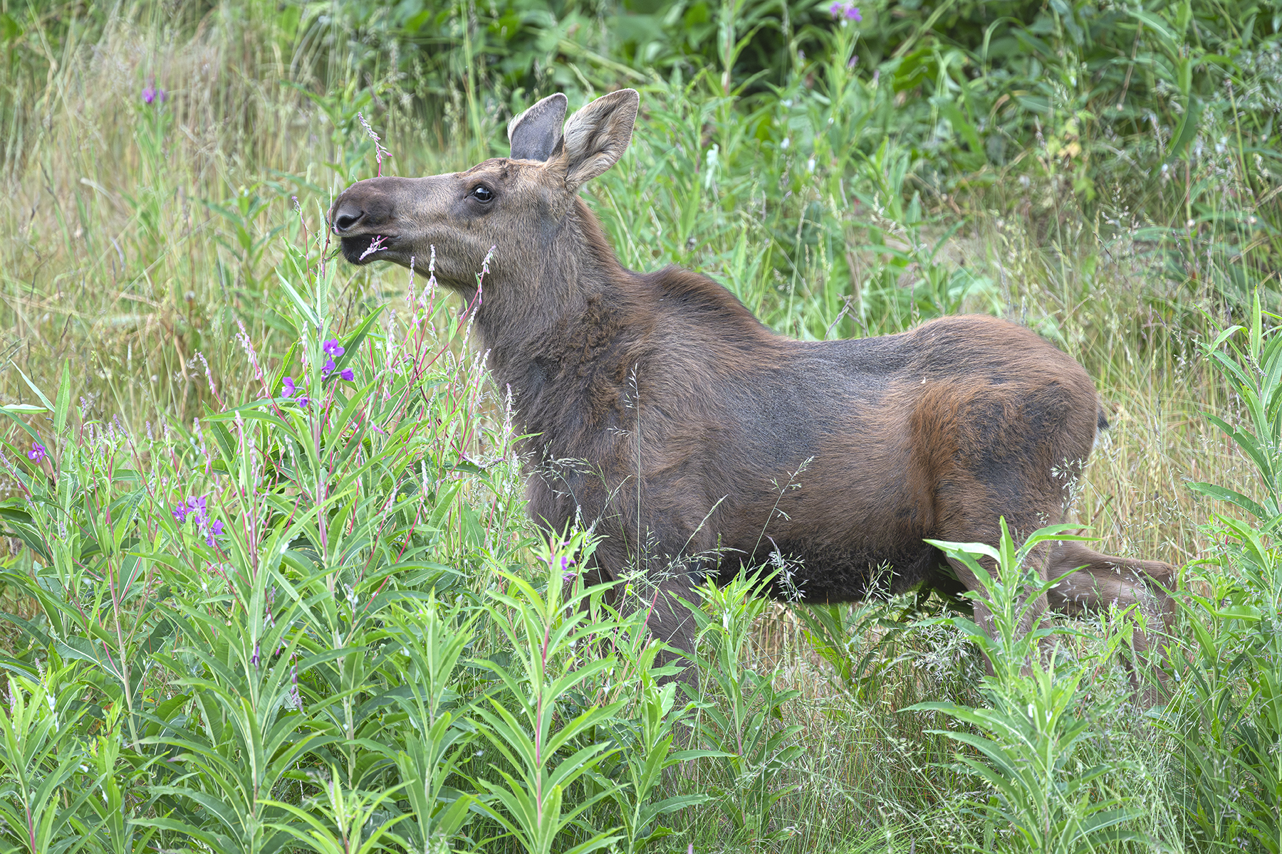 La fin du printemps et le début de l’été sont les meilleures périodes pour photographier les femelles et leurs jeunes de l’année. Quelle que soit l’espèce, l’exercice demande énormément de patience, de persévérance et de chance, les animaux demeurant extrêmement discrets et vigilants durant cette étape de la reproduction. En début d’été, nous avons photographié quelques femelles et cabris du Mouflon de Dall (images 1 à 4) dans les Chugach Mountains et une femelle de Marmotte des Rocheuses surveillant ses trois marmottons dans les Talkeetna Mountains (images 5 à 7). Fin-mai, en différents endroits, nous avons trouvé quelques orignaux en pleine mue printanière (images 11 et 21 à 23). Le 29 mai, aux abords de la Delta River, nous avons découvert une femelle d’Orignal et son petit, né probablement le jour-même ou le jour précédent (images 15 et 16). Immobilisés inconfortablement entre un ravin et le courant impétueux de la rivière, la femelle ne semblait trouver aucune issue alors que son petit, pris de panique, beuglait au point d’être secouru par une autre et superbe femelle non suitée (image 17). Début juin, dans la région d’Eagle River, alors que nous faisions de l’affût au castor, une femelle d’Orignal et son petit, poursuivis par un ours brun, ont déboulé à quelques mètres de nos objectifs (images 12 à 14). N’ayant eu que très peu d’opportunités de rencontrer des castors, nous nous sommes reportés sur le Rat musqué que nous avons observé à huit reprises (images 27 à 29). Enfin, gros coup de chance à Homer, en parcourant l’un des sentiers du Wynn Nature Center : après maintes recherches infructueuses, nous réussissons enfin à photographier une femelle de Porc-épic et son petit. Il nous aura fallu patienter plus de deux heures pour que le nouveau-né veuille bien nous montrer sa sympathique frimousse.