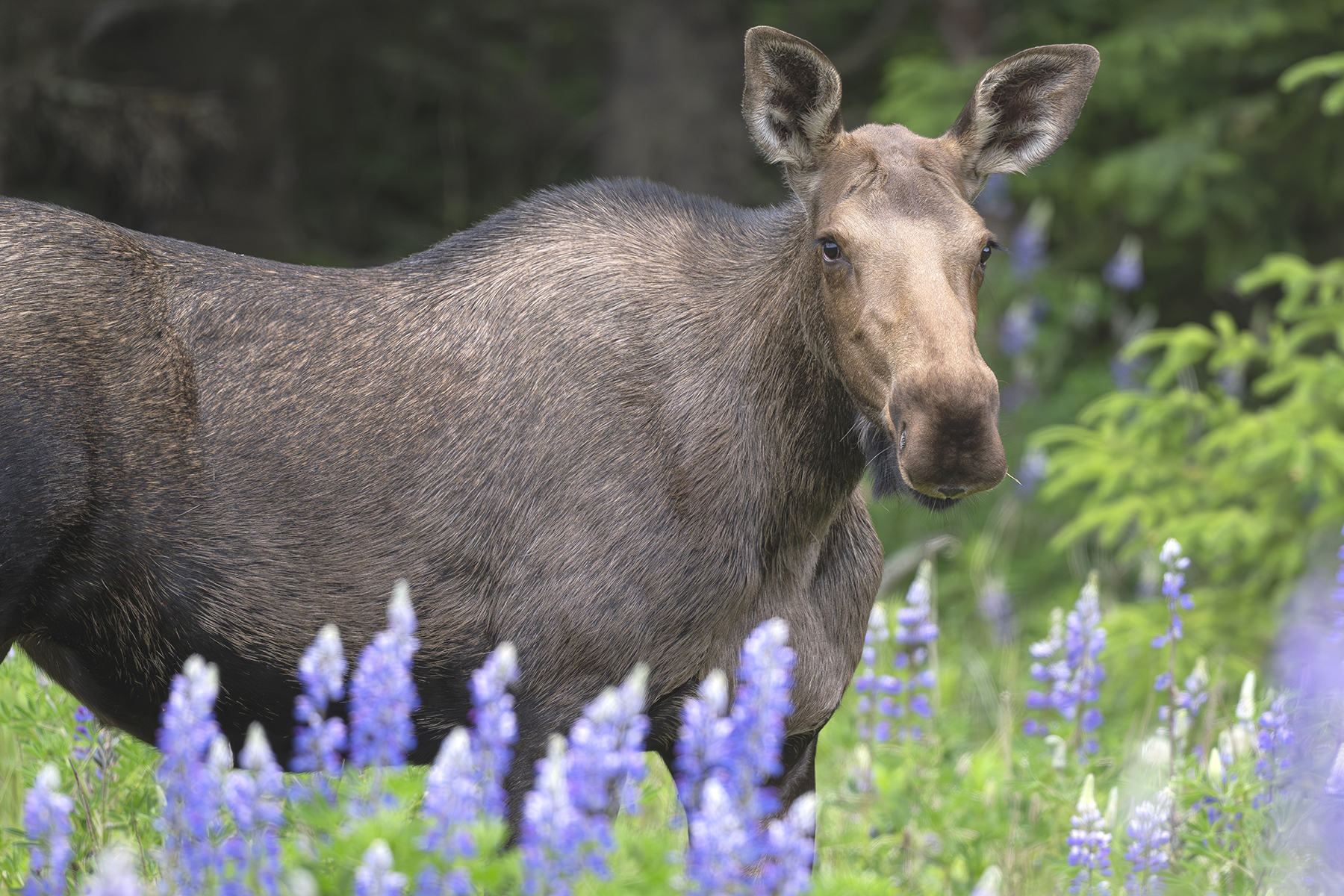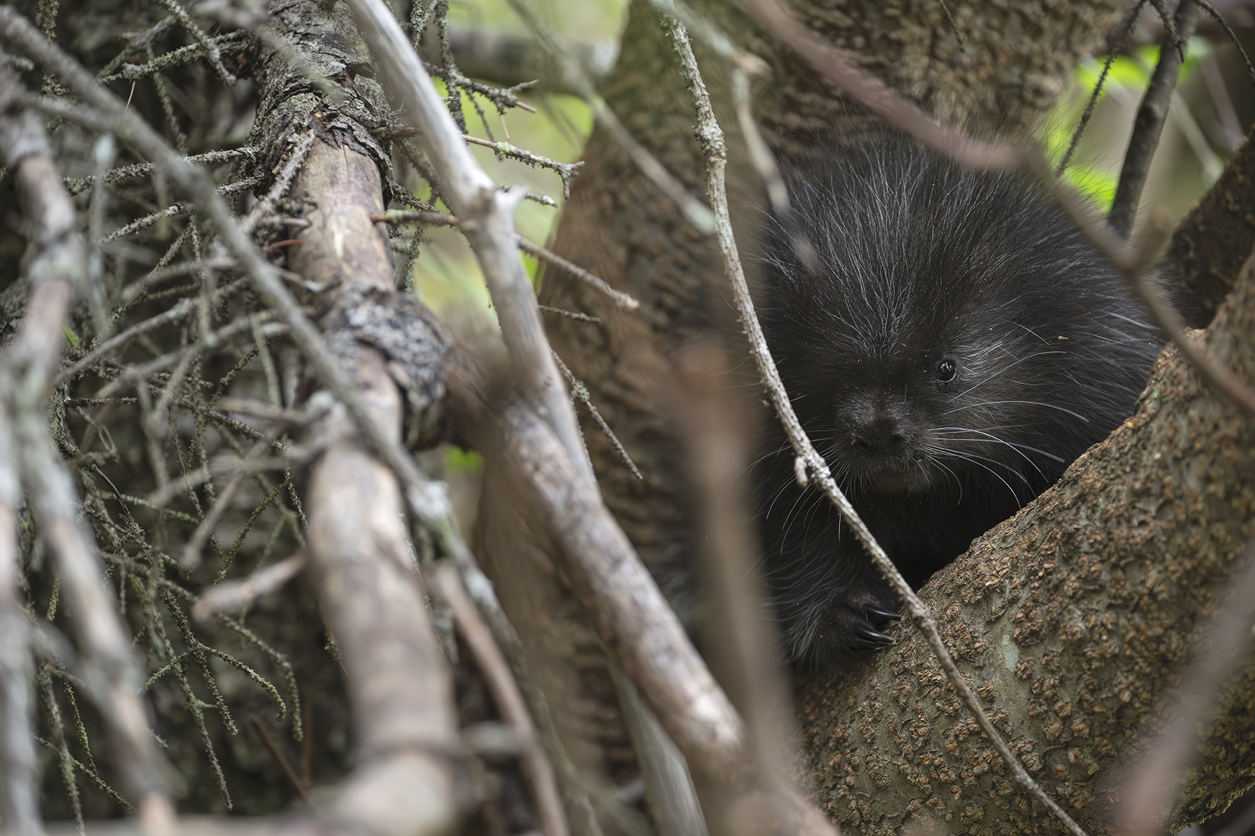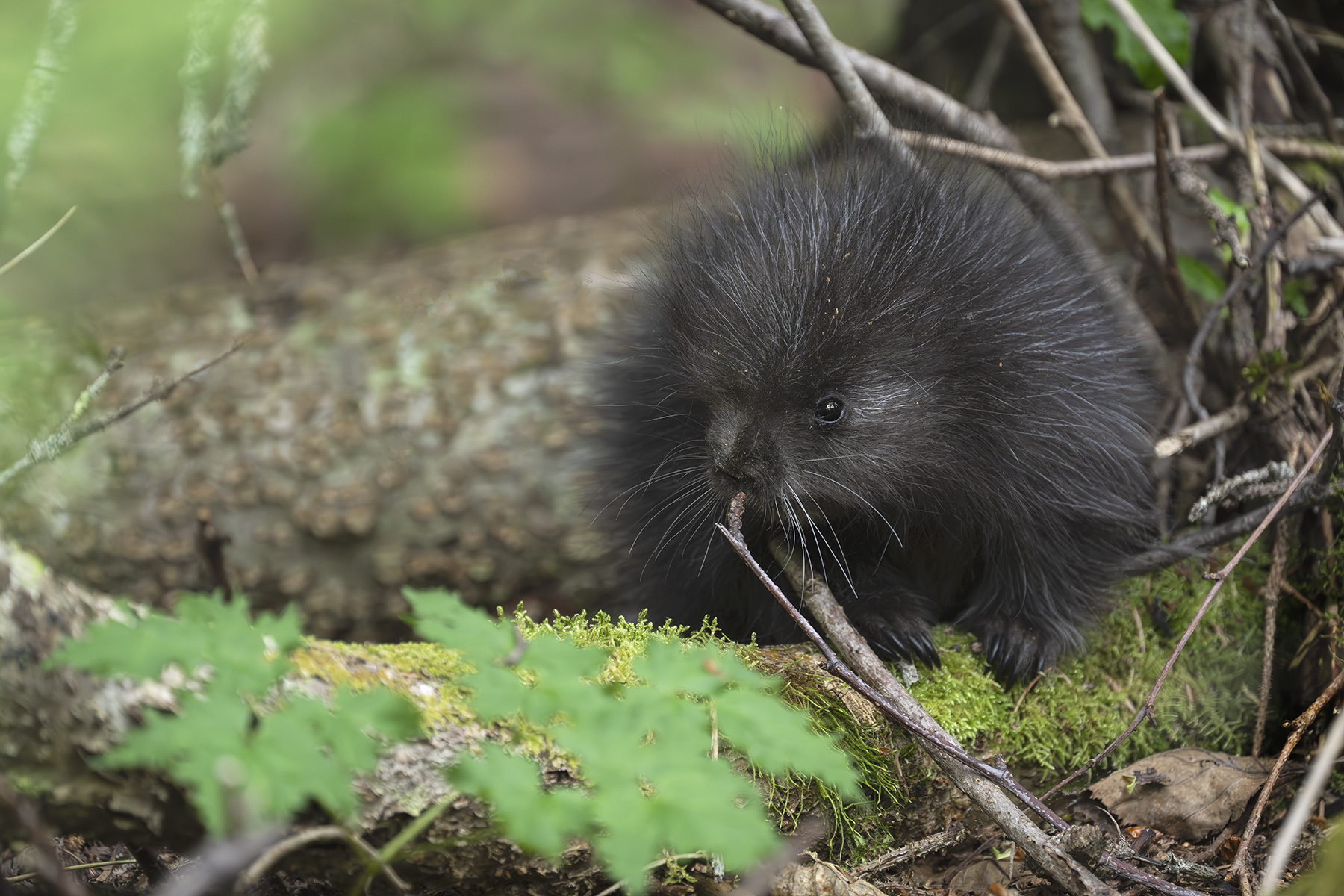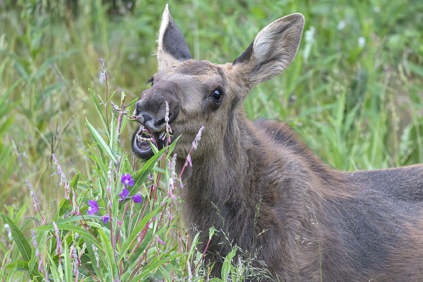 La fin du printemps et le début de l’été sont les meilleures périodes pour photographier les femelles et leurs jeunes de l’année. Quelle que soit l’espèce, l’exercice demande énormément de patience, de persévérance et de chance, les animaux demeurant extrêmement discrets et vigilants durant cette étape de la reproduction. En début d’été, nous avons photographié quelques femelles et cabris du Mouflon de Dall (images 1 à 4) dans les Chugach Mountains et une femelle de Marmotte des Rocheuses surveillant ses trois marmottons dans les Talkeetna Mountains (images 5 à 7). Fin-mai, en différents endroits, nous avons trouvé quelques orignaux en pleine mue printanière (images 11 et 21 à 23). Le 29 mai, aux abords de la Delta River, nous avons découvert une femelle d’Orignal et son petit, né probablement le jour-même ou le jour précédent (images 15 et 16). Immobilisés inconfortablement entre un ravin et le courant impétueux de la rivière, la femelle ne semblait trouver aucune issue alors que son petit, pris de panique, beuglait au point d’être secouru par une autre et superbe femelle non suitée (image 17). Début juin, dans la région d’Eagle River, alors que nous faisions de l’affût au castor, une femelle d’Orignal et son petit, poursuivis par un ours brun, ont déboulé à quelques mètres de nos objectifs (images 12 à 14). N’ayant eu que très peu d’opportunités de rencontrer des castors, nous nous sommes reportés sur le Rat musqué que nous avons observé à huit reprises (images 27 à 29). Enfin, gros coup de chance à Homer, en parcourant l’un des sentiers du Wynn Nature Center : après maintes recherches infructueuses, nous réussissons enfin à photographier une femelle de Porc-épic et son petit. Il nous aura fallu patienter plus de deux heures pour que le nouveau-né veuille bien nous montrer sa sympathique frimousse.