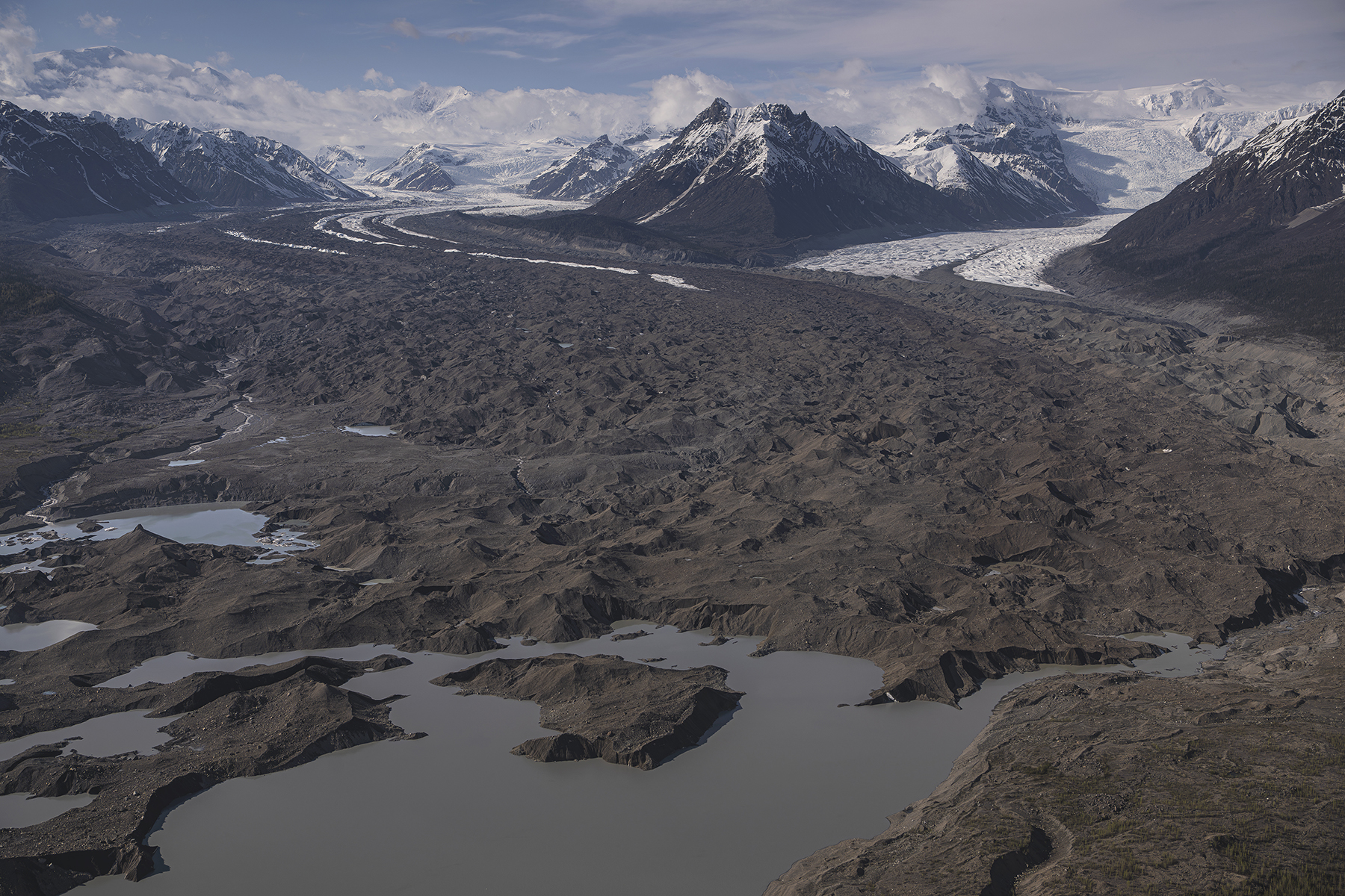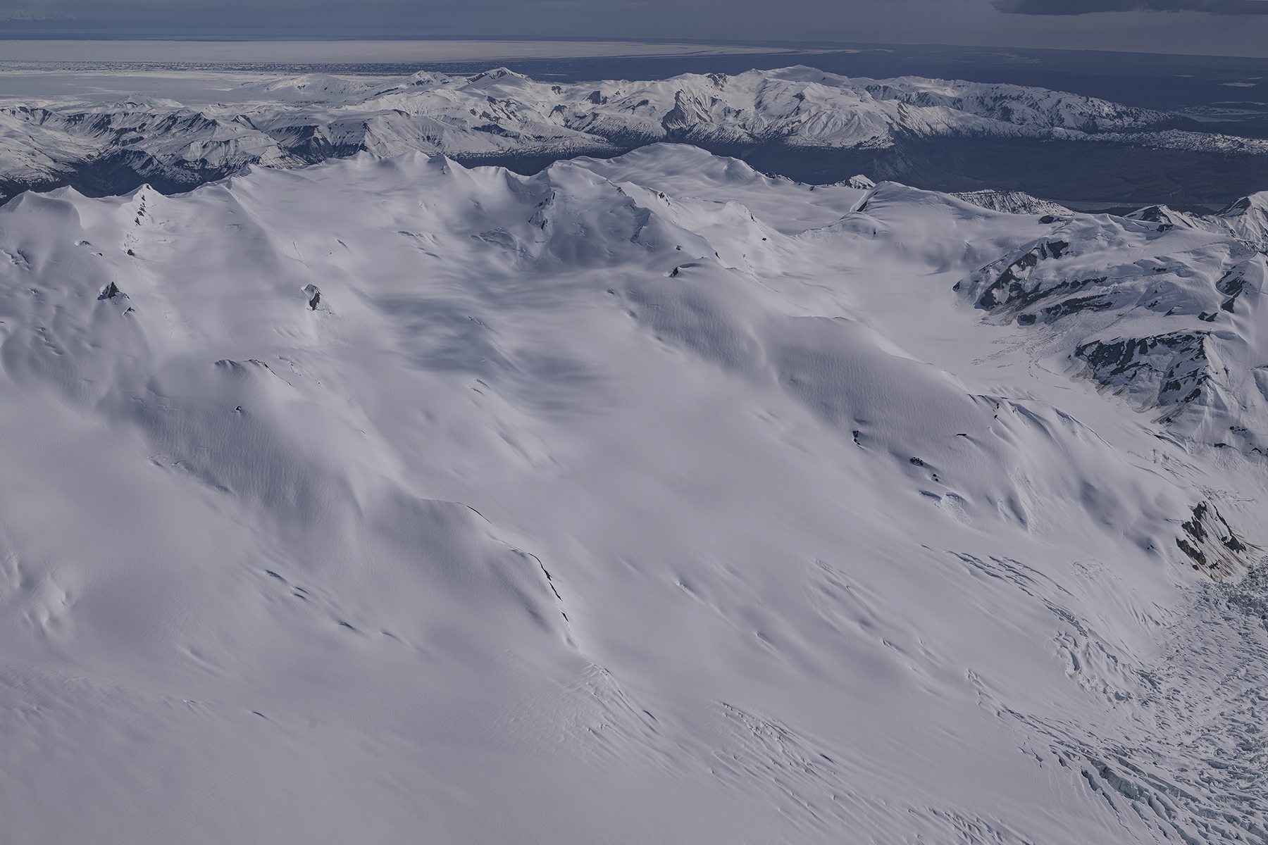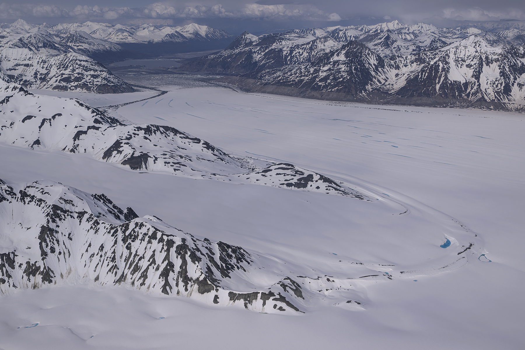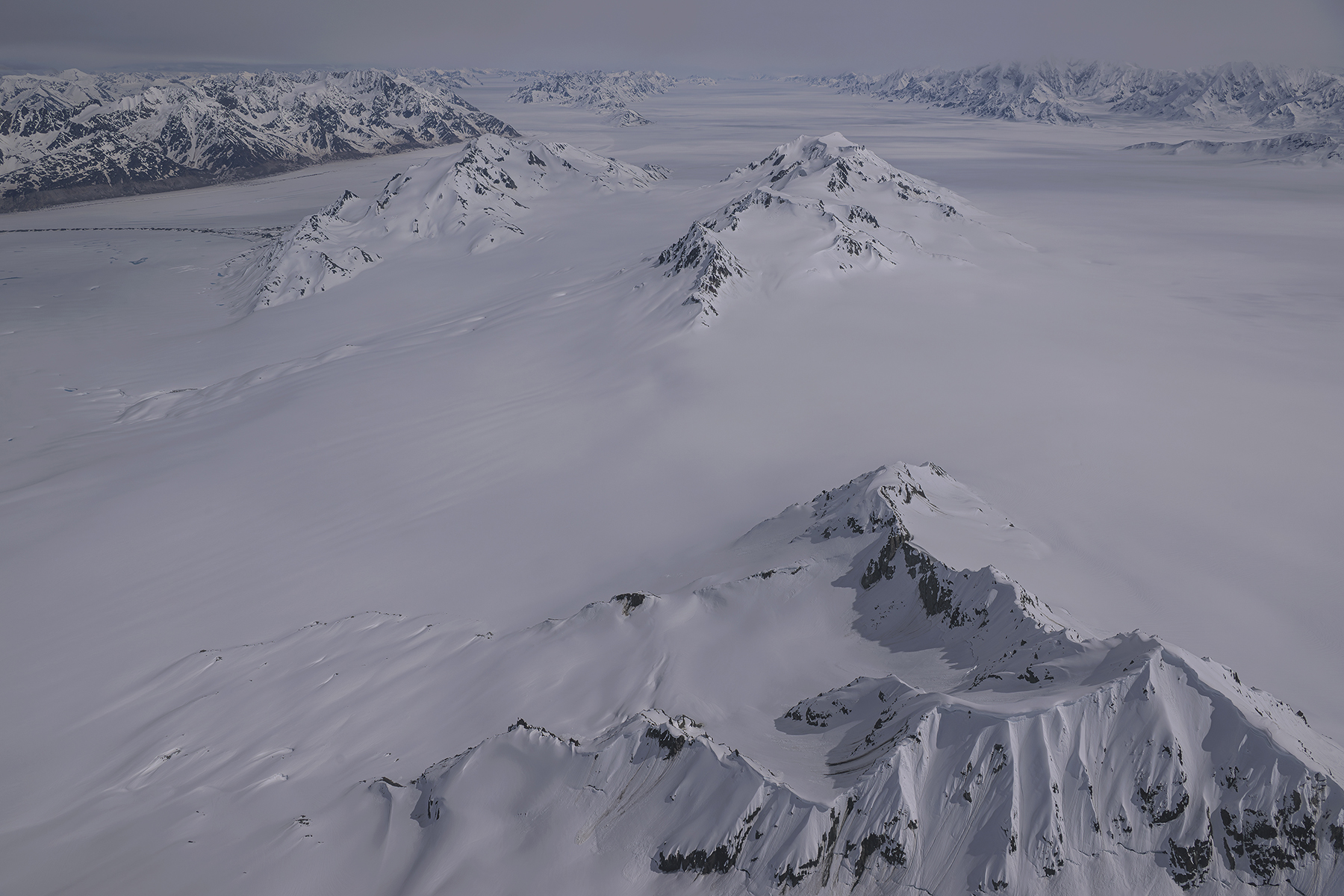 Le parc national de Wrangell–Saint-Élie, le plus grand des États-Unis, abrite la plupart des plus hauts sommets d’Alaska et 60 % des terres couvertes en permanence de glace, situés à proximité immédiate de l’Océan Pacifique (Golfe d’Alaska). Le mont Saint-Élie (image 18), qui culmine à 5’488 mètres d’altitude, est le point le plus élevé du massif. Situé à la frontière entre États-Unis et Canada, il est le deuxième sommet le plus élevé d’Amérique du Nord. Ne se trouvant qu’à 18 kilomètres de la mer, l’imposante verticalité de son relief évoque les hauts sommets himalayens. Le parc national de Wrangell–Saint-Élie a été façonné par les forces opposées du volcanisme et de la glaciation, ses hautes montagnes ayant été soulevées par la tectonique des plaques. Les paysages du parc comprennent les glaciers Tana (images 1 à 5), Bremner (image 6), Kennicott (images 7 à 9), Bering (images 16 et 36) et Malaspina (images 20 à 23), le plus grand glacier de piémont d’Amérique du Nord qui se déverse dans la baie de Yakutat (images 24 et 25). Le champ de glace Bagley (images 14, 15 et 33), forme la deuxième plus grande masse glaciaire non polaire d’Amérique du Nord. Isolé parmi les champs de glace, le mont Steller (image 34), forme le point culminant de la Waxell Ridge (images 33 et 35), une crête située sur le côté sud du champ de glace Bagley. Quant à Icy Bay (images 26 à 28), elle figure parmi les plus beaux joyaux naturels d’Alaska. Cette baie s’est formée par suite du retrait rapide des glaciers Guyot (images 27 et 29), Yahtse (images 30 et 31) et Tyndall (image 32).