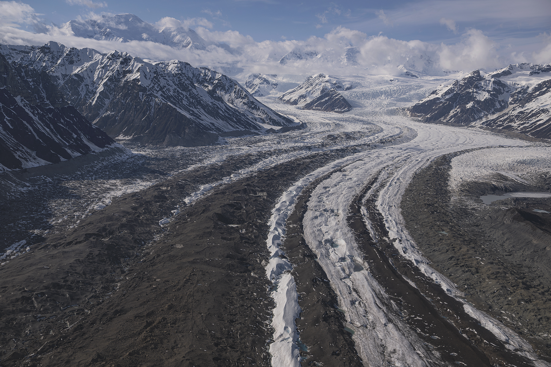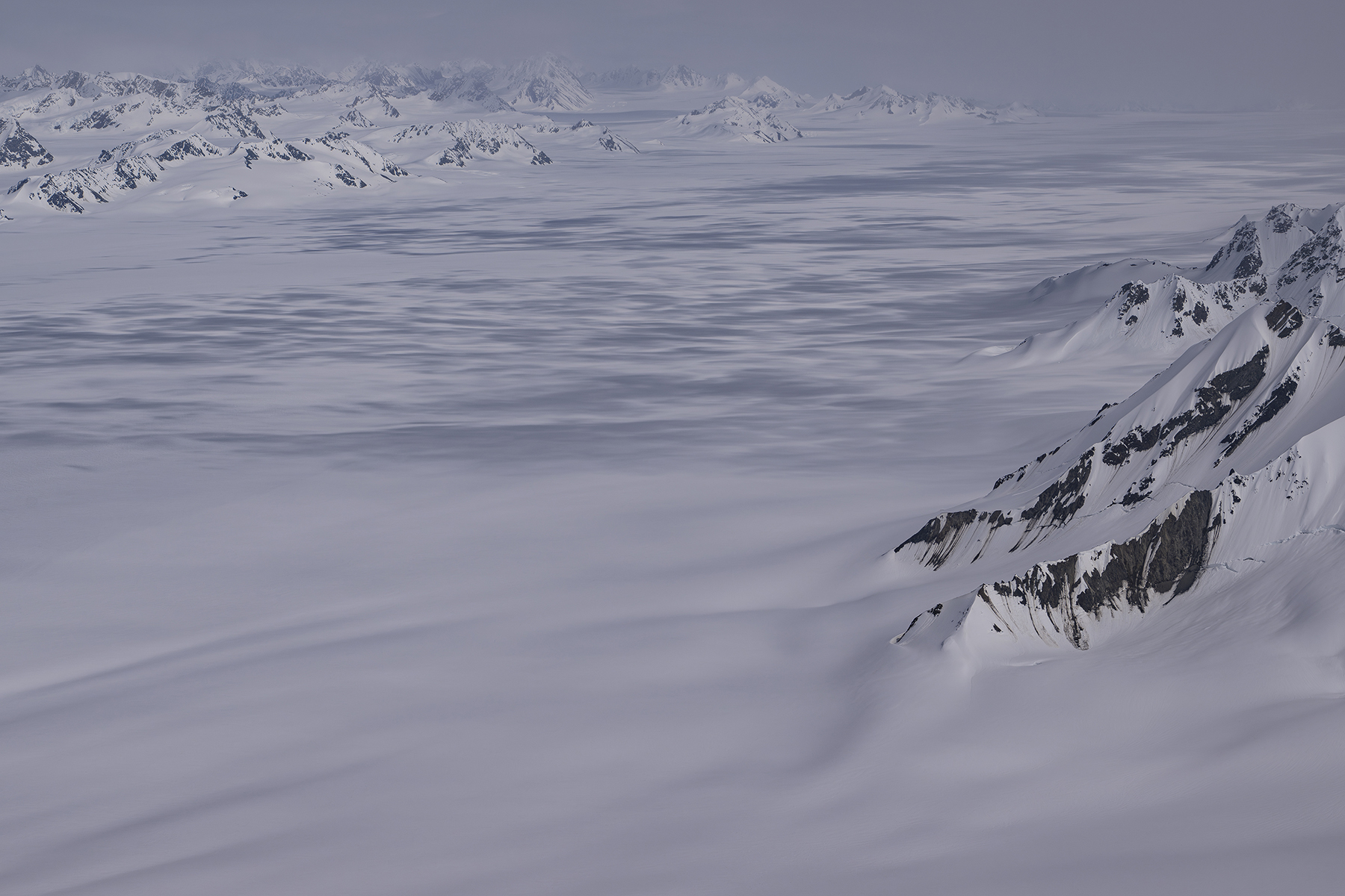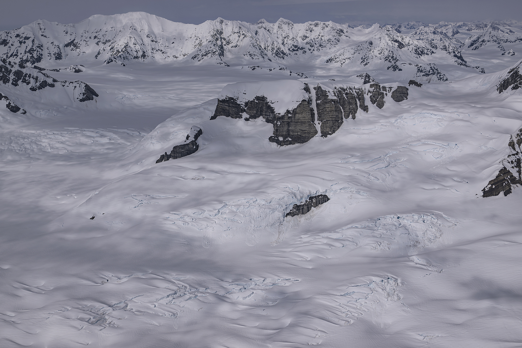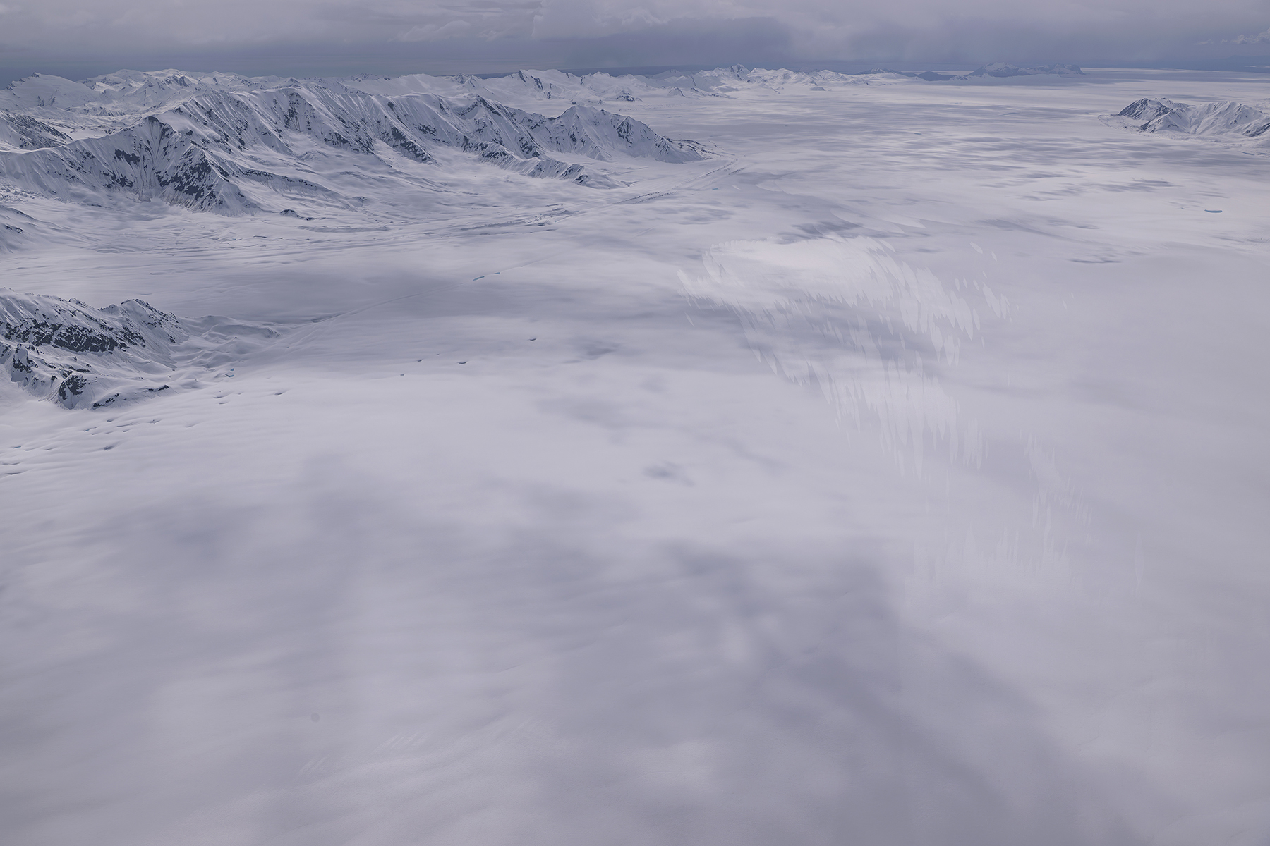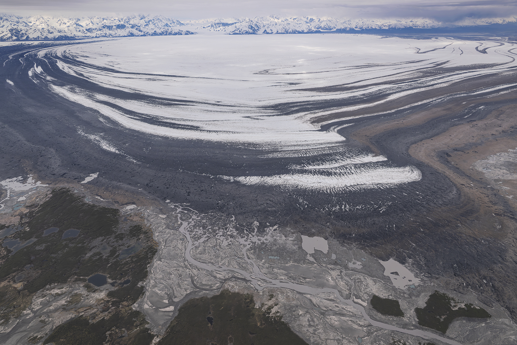 Le parc national de Wrangell–Saint-Élie, le plus grand des États-Unis, abrite la plupart des plus hauts sommets d’Alaska et 60 % des terres couvertes en permanence de glace, situés à proximité immédiate de l’Océan Pacifique (Golfe d’Alaska). Le mont Saint-Élie (image 18), qui culmine à 5’488 mètres d’altitude, est le point le plus élevé du massif. Situé à la frontière entre États-Unis et Canada, il est le deuxième sommet le plus élevé d’Amérique du Nord. Ne se trouvant qu’à 18 kilomètres de la mer, l’imposante verticalité de son relief évoque les hauts sommets himalayens. Le parc national de Wrangell–Saint-Élie a été façonné par les forces opposées du volcanisme et de la glaciation, ses hautes montagnes ayant été soulevées par la tectonique des plaques. Les paysages du parc comprennent les glaciers Tana (images 1 à 5), Bremner (image 6), Kennicott (images 7 à 9), Bering (images 16 et 36) et Malaspina (images 20 à 23), le plus grand glacier de piémont d’Amérique du Nord qui se déverse dans la baie de Yakutat (images 24 et 25). Le champ de glace Bagley (images 14, 15 et 33), forme la deuxième plus grande masse glaciaire non polaire d’Amérique du Nord. Isolé parmi les champs de glace, le mont Steller (image 34), forme le point culminant de la Waxell Ridge (images 33 et 35), une crête située sur le côté sud du champ de glace Bagley. Quant à Icy Bay (images 26 à 28), elle figure parmi les plus beaux joyaux naturels d’Alaska. Cette baie s’est formée par suite du retrait rapide des glaciers Guyot (images 27 et 29), Yahtse (images 30 et 31) et Tyndall (image 32).