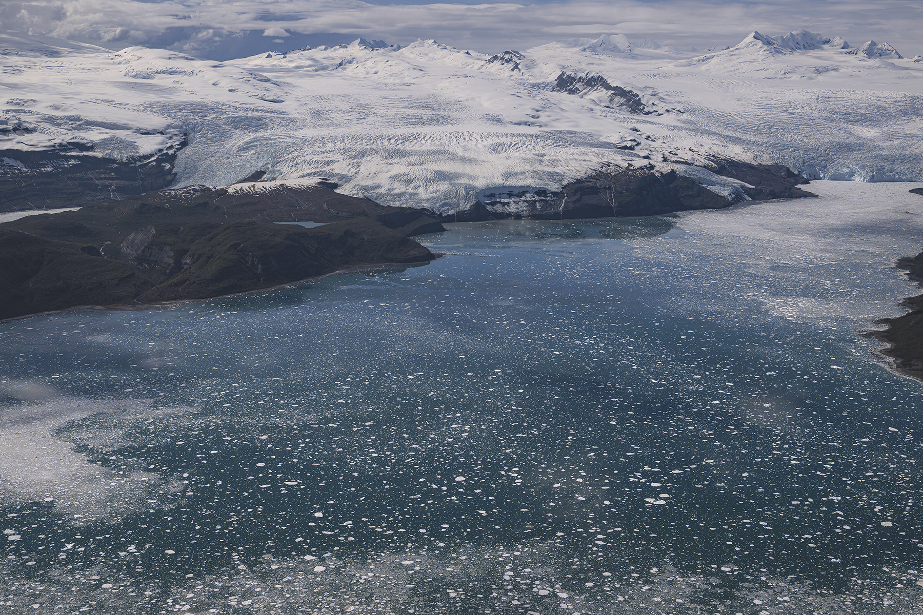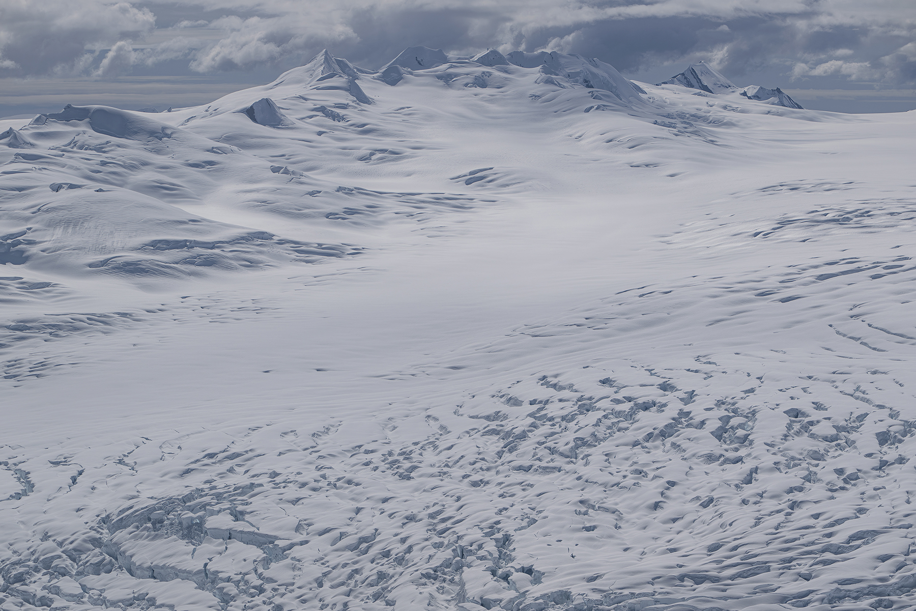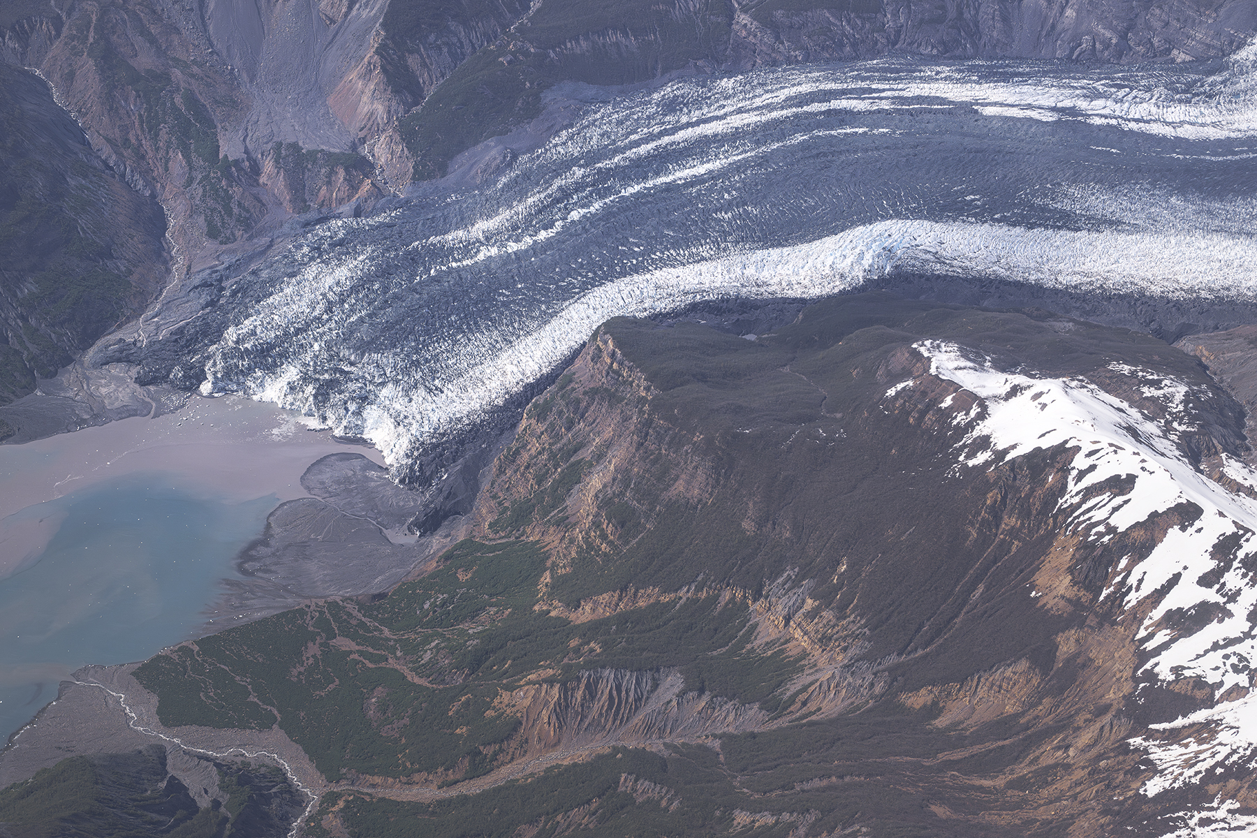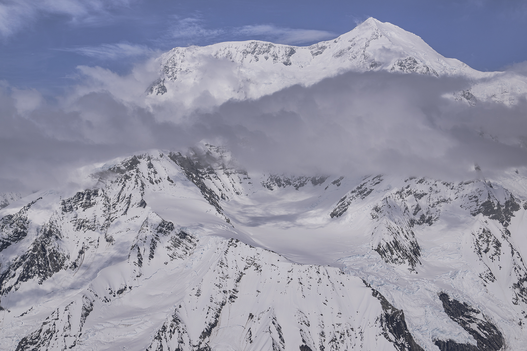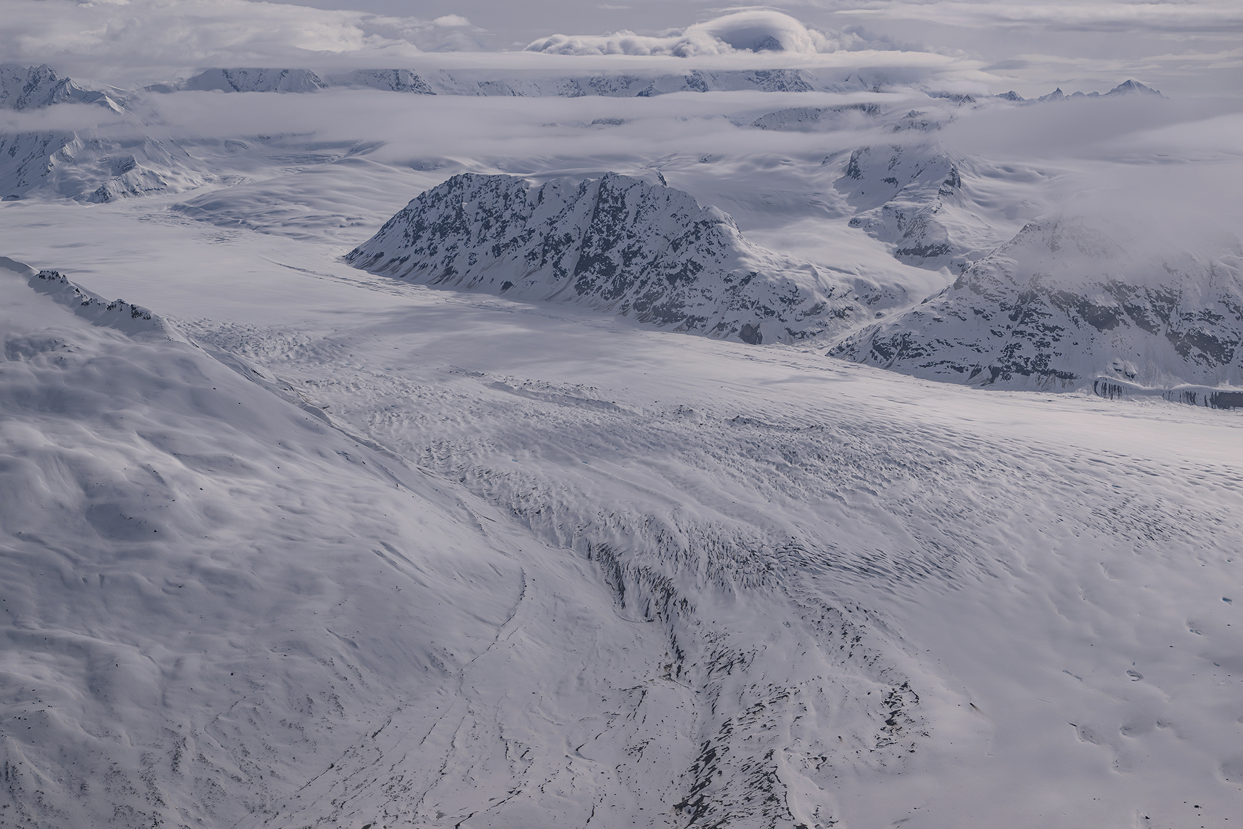 Le parc national de Wrangell–Saint-Élie, le plus grand des États-Unis, abrite la plupart des plus hauts sommets d’Alaska et 60 % des terres couvertes en permanence de glace, situés à proximité immédiate de l’Océan Pacifique (Golfe d’Alaska). Le mont Saint-Élie (image 18), qui culmine à 5’488 mètres d’altitude, est le point le plus élevé du massif. Situé à la frontière entre États-Unis et Canada, il est le deuxième sommet le plus élevé d’Amérique du Nord. Ne se trouvant qu’à 18 kilomètres de la mer, l’imposante verticalité de son relief évoque les hauts sommets himalayens. Le parc national de Wrangell–Saint-Élie a été façonné par les forces opposées du volcanisme et de la glaciation, ses hautes montagnes ayant été soulevées par la tectonique des plaques. Les paysages du parc comprennent les glaciers Tana (images 1 à 5), Bremner (image 6), Kennicott (images 7 à 9), Bering (images 16 et 36) et Malaspina (images 20 à 23), le plus grand glacier de piémont d’Amérique du Nord qui se déverse dans la baie de Yakutat (images 24 et 25). Le champ de glace Bagley (images 14, 15 et 33), forme la deuxième plus grande masse glaciaire non polaire d’Amérique du Nord. Isolé parmi les champs de glace, le mont Steller (image 34), forme le point culminant de la Waxell Ridge (images 33 et 35), une crête située sur le côté sud du champ de glace Bagley. Quant à Icy Bay (images 26 à 28), elle figure parmi les plus beaux joyaux naturels d’Alaska. Cette baie s’est formée par suite du retrait rapide des glaciers Guyot (images 27 et 29), Yahtse (images 30 et 31) et Tyndall (image 32).