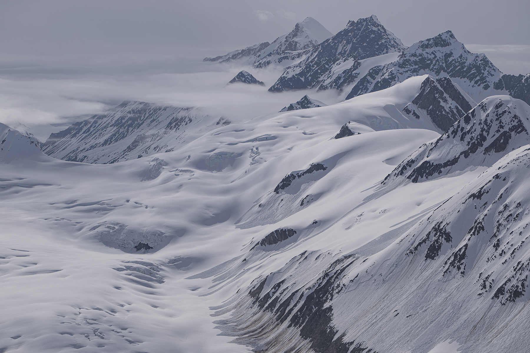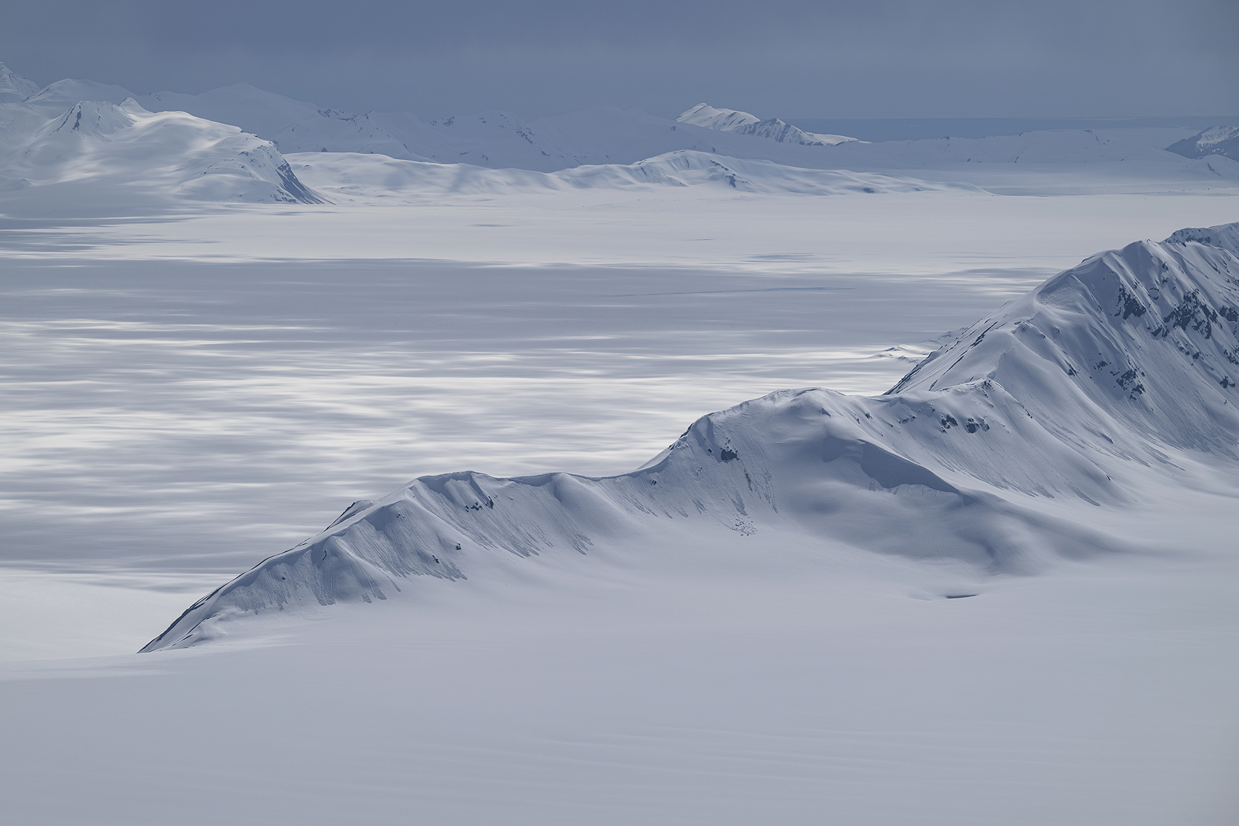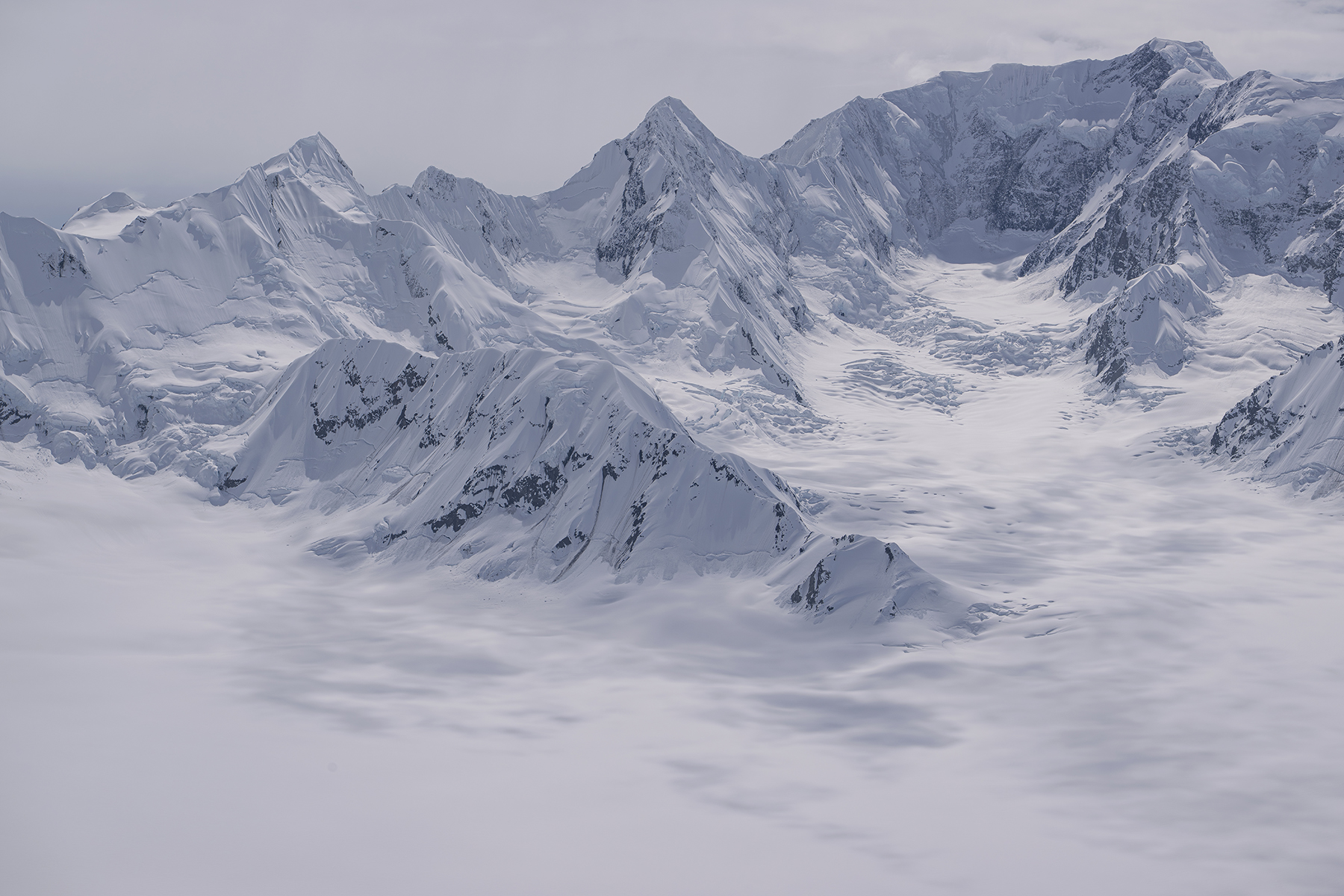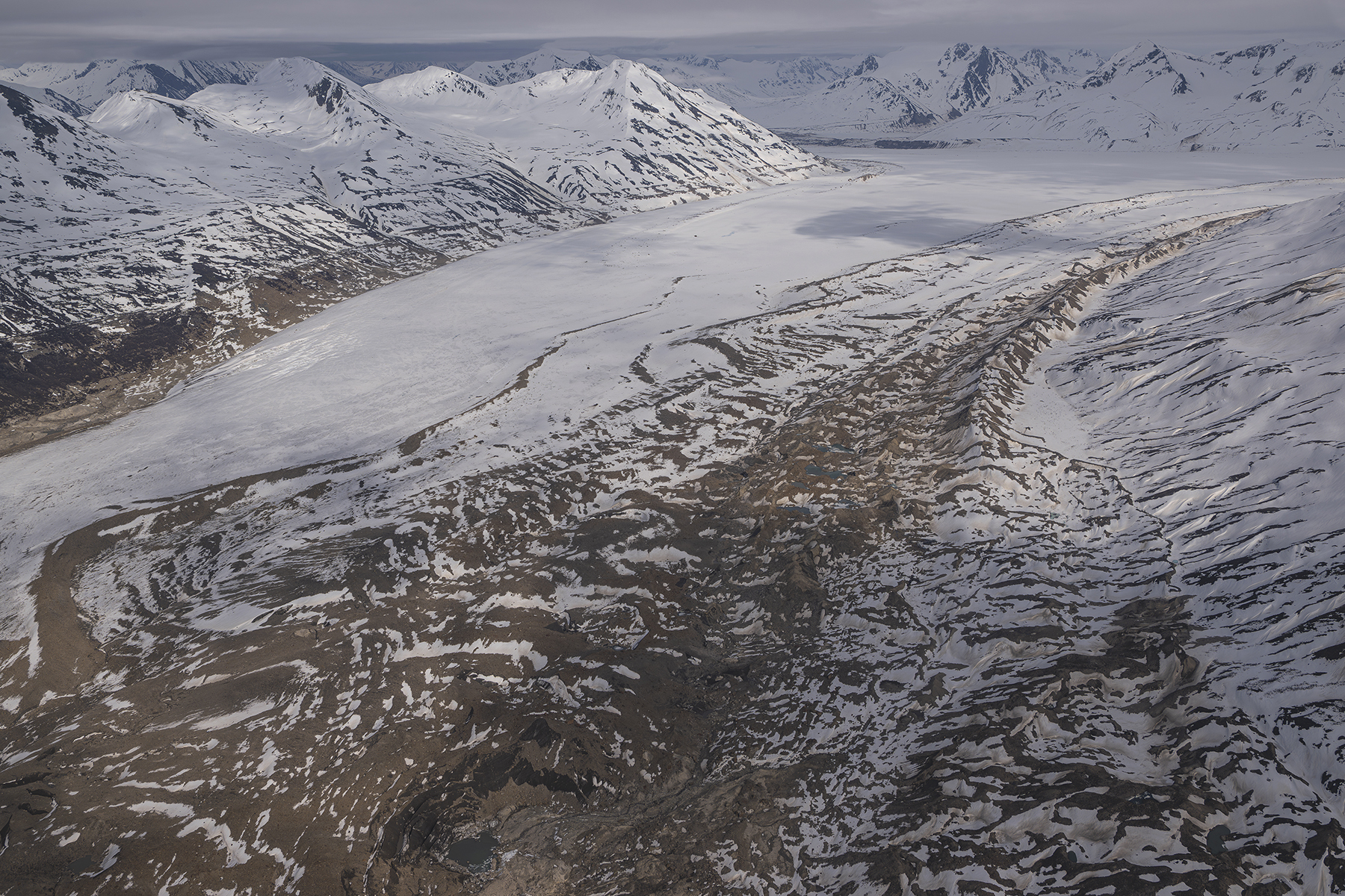 Le parc national de Wrangell–Saint-Élie, le plus grand des États-Unis, abrite la plupart des plus hauts sommets d’Alaska et 60 % des terres couvertes en permanence de glace, situés à proximité immédiate de l’Océan Pacifique (Golfe d’Alaska). Le mont Saint-Élie (image 18), qui culmine à 5’488 mètres d’altitude, est le point le plus élevé du massif. Situé à la frontière entre États-Unis et Canada, il est le deuxième sommet le plus élevé d’Amérique du Nord. Ne se trouvant qu’à 18 kilomètres de la mer, l’imposante verticalité de son relief évoque les hauts sommets himalayens. Le parc national de Wrangell–Saint-Élie a été façonné par les forces opposées du volcanisme et de la glaciation, ses hautes montagnes ayant été soulevées par la tectonique des plaques. Les paysages du parc comprennent les glaciers Tana (images 1 à 5), Bremner (image 6), Kennicott (images 7 à 9), Bering (images 16 et 36) et Malaspina (images 20 à 23), le plus grand glacier de piémont d’Amérique du Nord qui se déverse dans la baie de Yakutat (images 24 et 25). Le champ de glace Bagley (images 14, 15 et 33), forme la deuxième plus grande masse glaciaire non polaire d’Amérique du Nord. Isolé parmi les champs de glace, le mont Steller (image 34), forme le point culminant de la Waxell Ridge (images 33 et 35), une crête située sur le côté sud du champ de glace Bagley. Quant à Icy Bay (images 26 à 28), elle figure parmi les plus beaux joyaux naturels d’Alaska. Cette baie s’est formée par suite du retrait rapide des glaciers Guyot (images 27 et 29), Yahtse (images 30 et 31) et Tyndall (image 32).