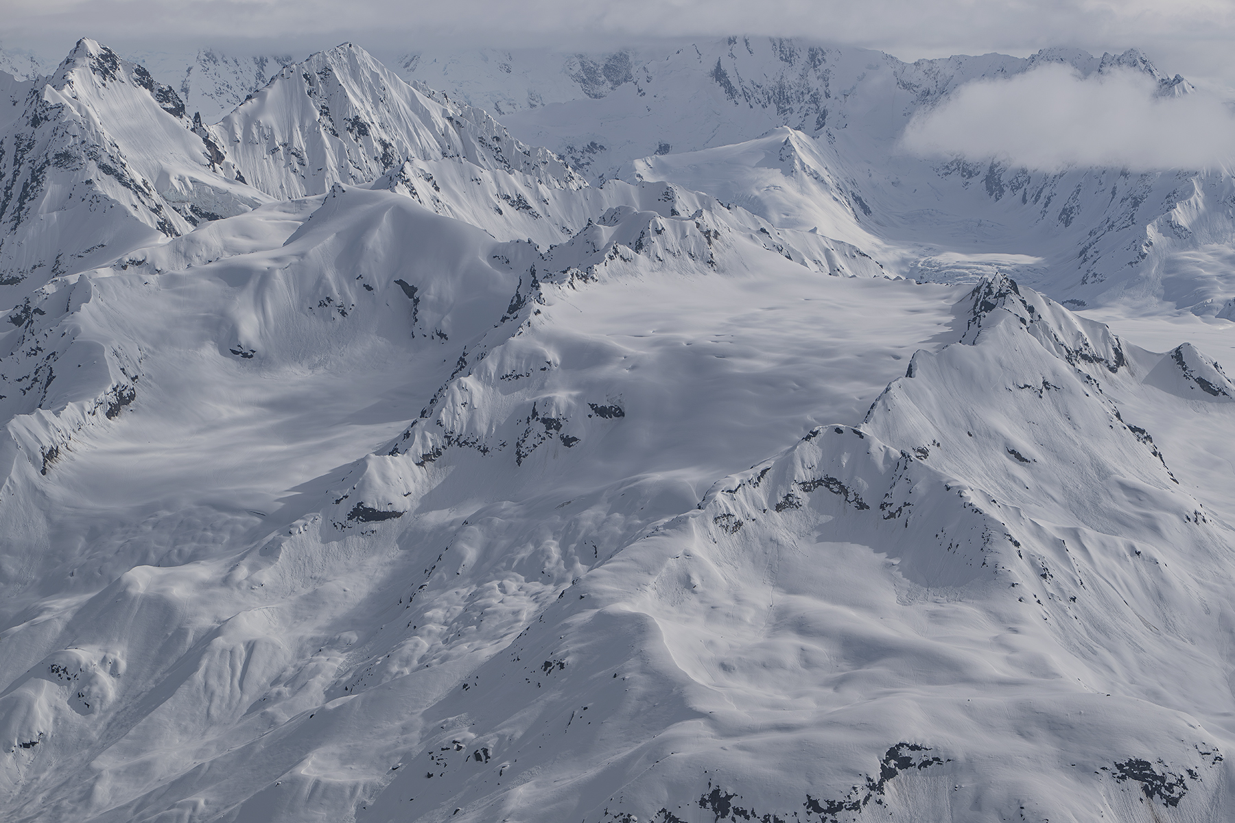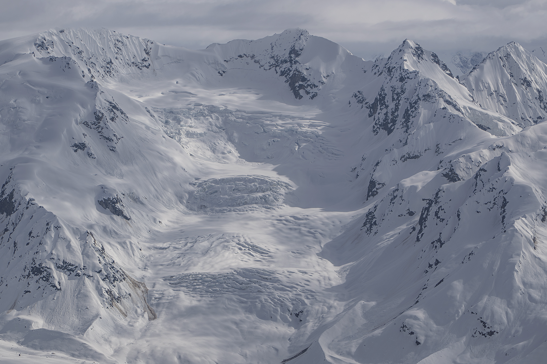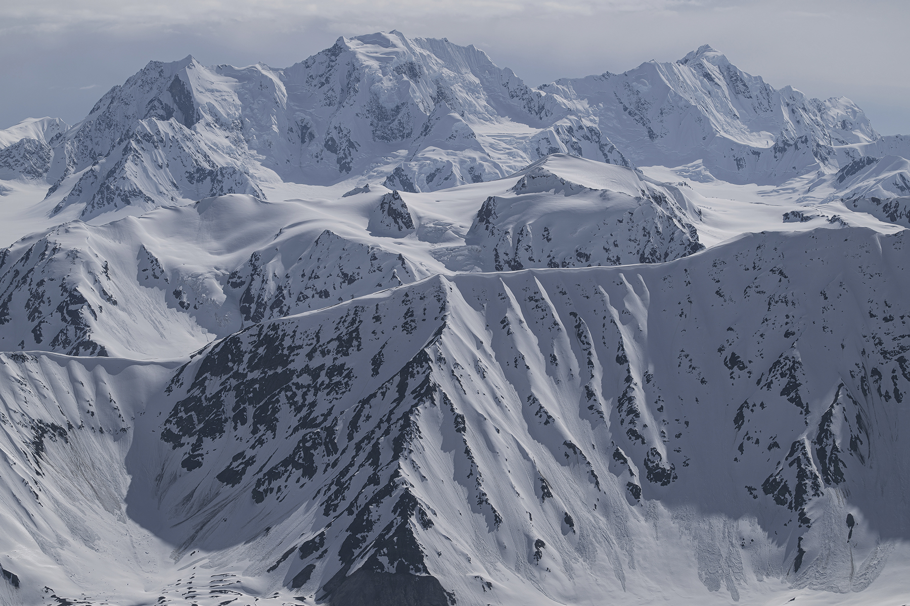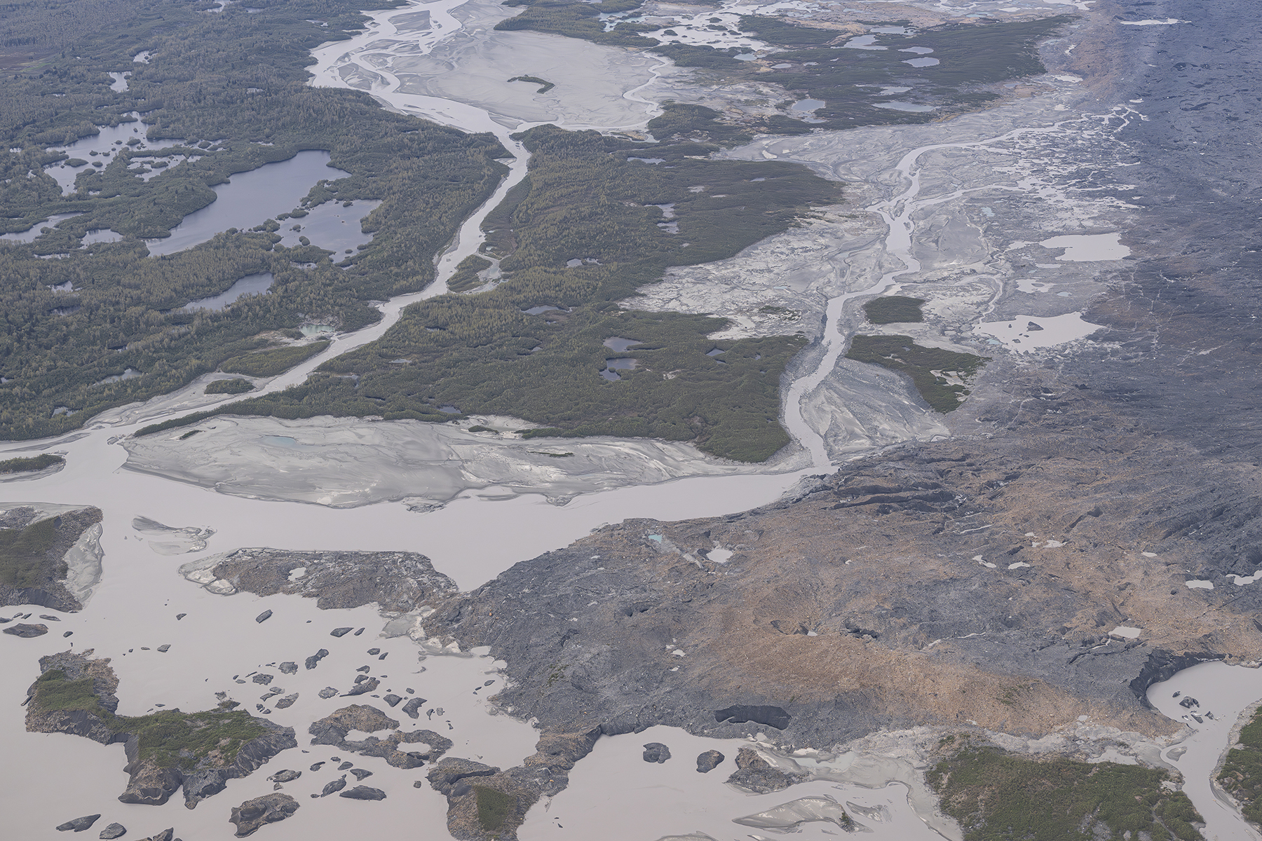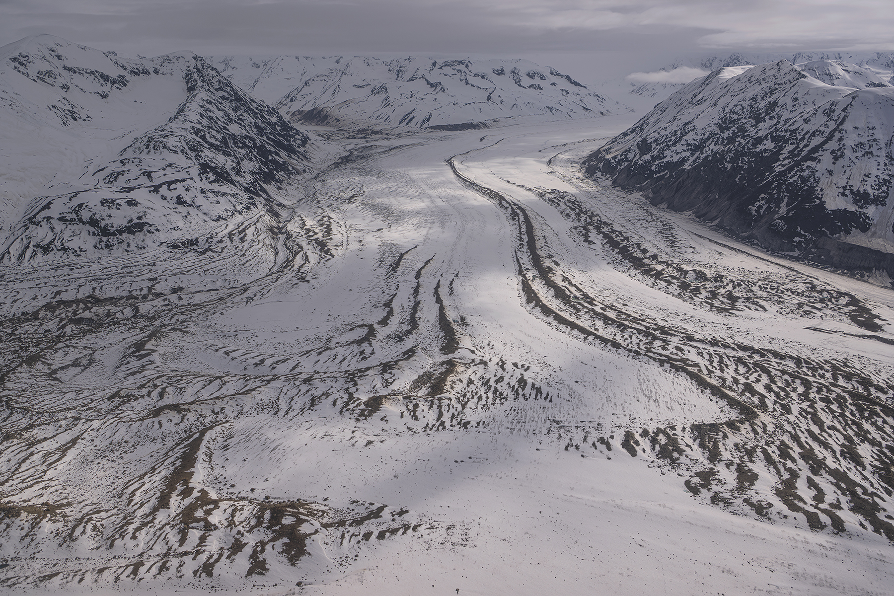 Le parc national de Wrangell–Saint-Élie, le plus grand des États-Unis, abrite la plupart des plus hauts sommets d’Alaska et 60 % des terres couvertes en permanence de glace, situés à proximité immédiate de l’Océan Pacifique (Golfe d’Alaska). Le mont Saint-Élie (image 18), qui culmine à 5’488 mètres d’altitude, est le point le plus élevé du massif. Situé à la frontière entre États-Unis et Canada, il est le deuxième sommet le plus élevé d’Amérique du Nord. Ne se trouvant qu’à 18 kilomètres de la mer, l’imposante verticalité de son relief évoque les hauts sommets himalayens. Le parc national de Wrangell–Saint-Élie a été façonné par les forces opposées du volcanisme et de la glaciation, ses hautes montagnes ayant été soulevées par la tectonique des plaques. Les paysages du parc comprennent les glaciers Tana (images 1 à 5), Bremner (image 6), Kennicott (images 7 à 9), Bering (images 16 et 36) et Malaspina (images 20 à 23), le plus grand glacier de piémont d’Amérique du Nord qui se déverse dans la baie de Yakutat (images 24 et 25). Le champ de glace Bagley (images 14, 15 et 33), forme la deuxième plus grande masse glaciaire non polaire d’Amérique du Nord. Isolé parmi les champs de glace, le mont Steller (image 34), forme le point culminant de la Waxell Ridge (images 33 et 35), une crête située sur le côté sud du champ de glace Bagley. Quant à Icy Bay (images 26 à 28), elle figure parmi les plus beaux joyaux naturels d’Alaska. Cette baie s’est formée par suite du retrait rapide des glaciers Guyot (images 27 et 29), Yahtse (images 30 et 31) et Tyndall (image 32).
